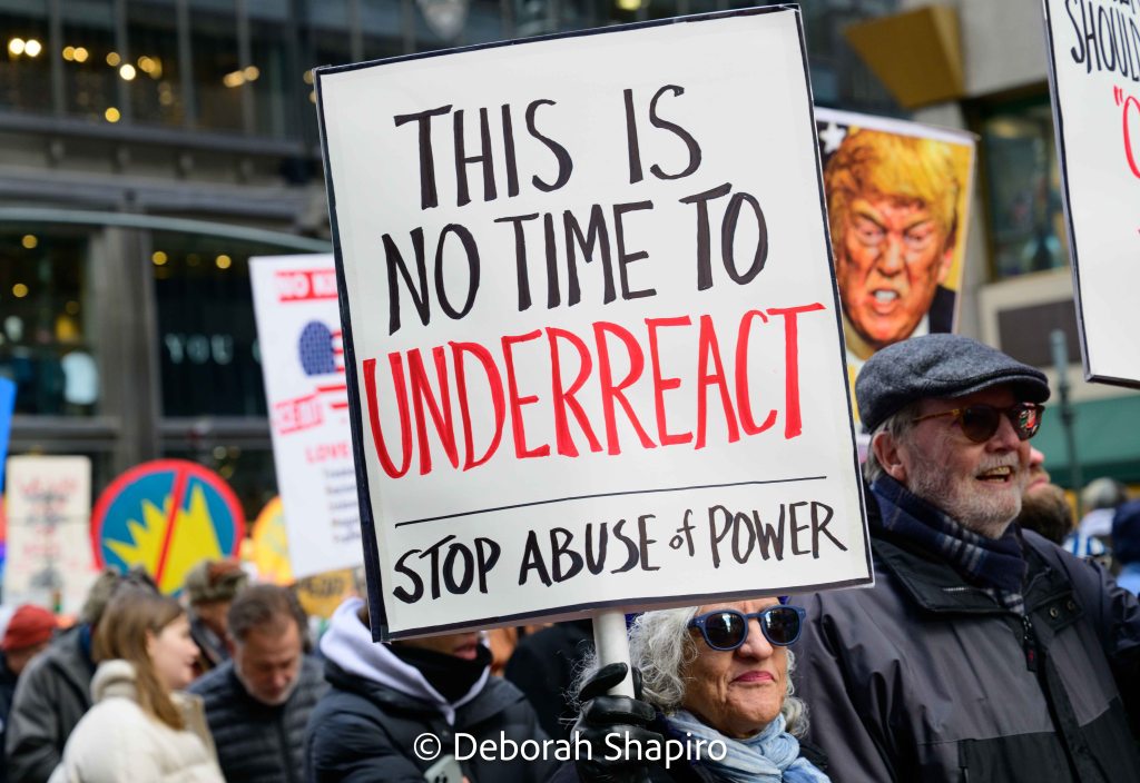 On April 5, tens of thousands of people, possibly 100,000, marched in New York City as part of nationwide protests against the administration. The estimate is that people joined 1600 protests across the country. In New York, the protesters filled 20 blocks of Fifth Avenue for over 3 hours. Well organized, peaceful, and orderly, the protest included families with children, people in wheelchairs, the elderly, and the young. A frequent chant was “This is What Democracy Looks Like.”
