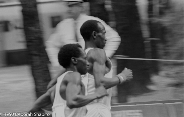 My first year shooting the New York Marathon. I positioned myself at the ramp off the Queensboro Bridge and waited for the lead runners to emerge on their way to First Avenue. I had a Pentax SLR with a manual focus lens and no motor drive, and I knew I would have only one chance to shoot the lead pack. I prefocused on a line on the street and waited until the runners just reached it, then got my shot of the leaders. Then, as the two leaders passed me, I did this quick pan shot of Juma Ikangaa, the previous year’s winner, and Douglas Wakiihuri, who went on to win that day. Then I walked to Central Park and shot the runners on the way to the finish line. In subsequent years I had press credentials and fancier camera equipment. I rode the women’s press truck one year; one year I sat shivering on the outer roadway of the Queensboro Bridge; one year I went to the start on Staten Island and stood on the concrete barrier separating the lanes on the Verrazano Bridge with over 20,000 runners pounding by on each side of me, hoping that I wouldn’t slip and be trampled. But this picture is my favorite of all the marathon photos I have taken.