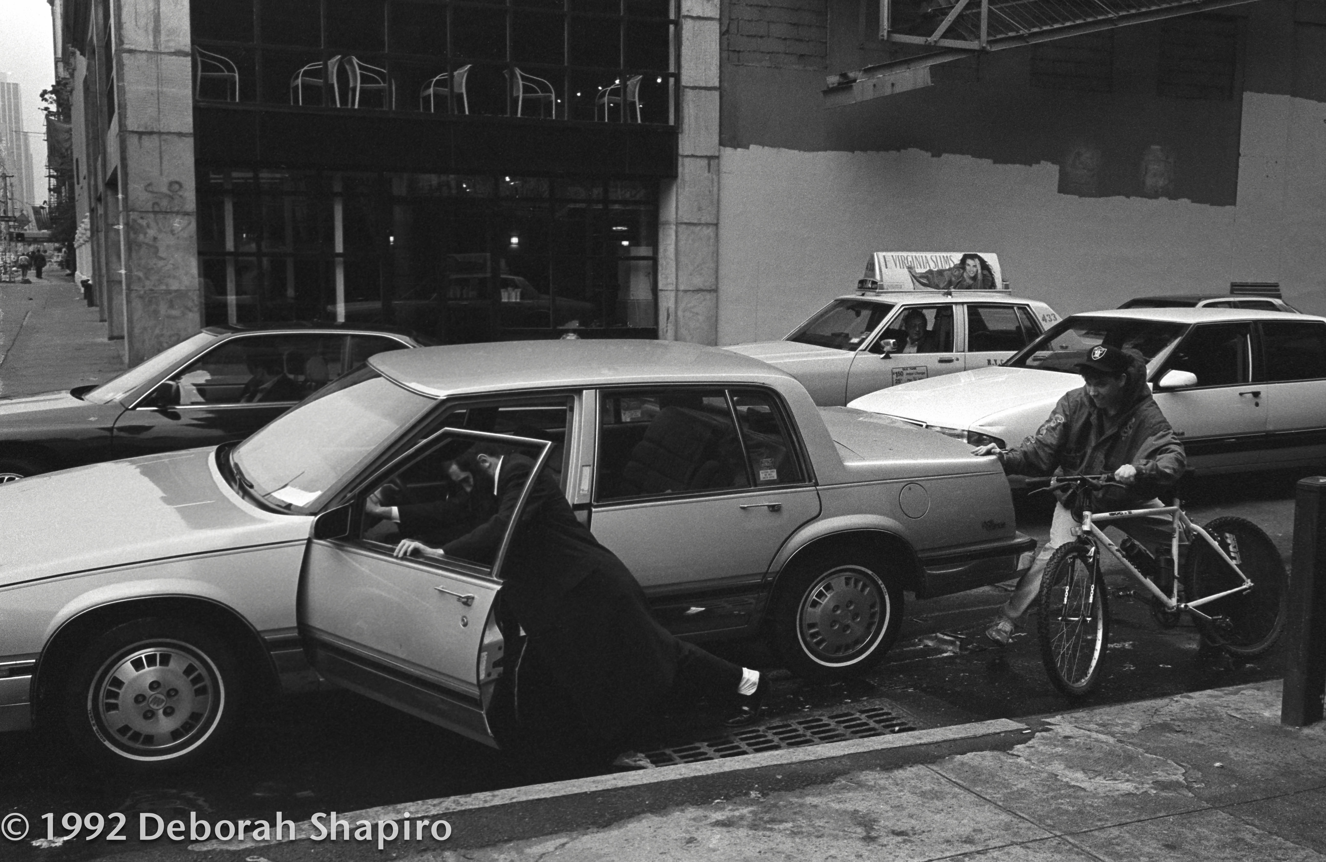 This being New York, the helpful passerby didn’t dare to let go of his bicycle while pushing the stalled car.