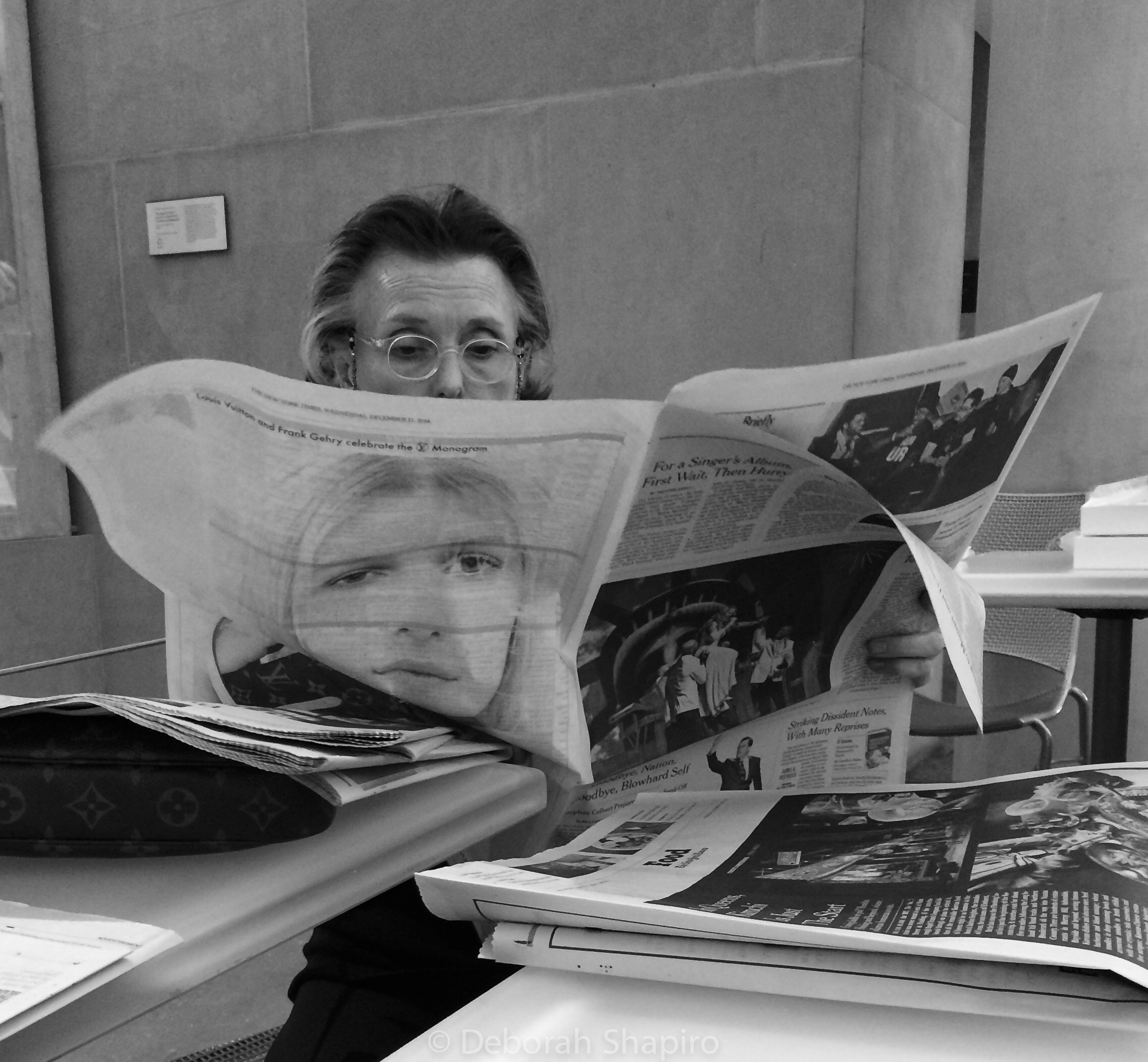 We know about manspreading – the male practice of sitting with knees far apart on the subway, occupying an extra seat. Here’s an example of womanspreading – occupying an extra seat or table with purse, newspaper, etc. Can I help it if she contrasts with the advertisement in the newspaper?