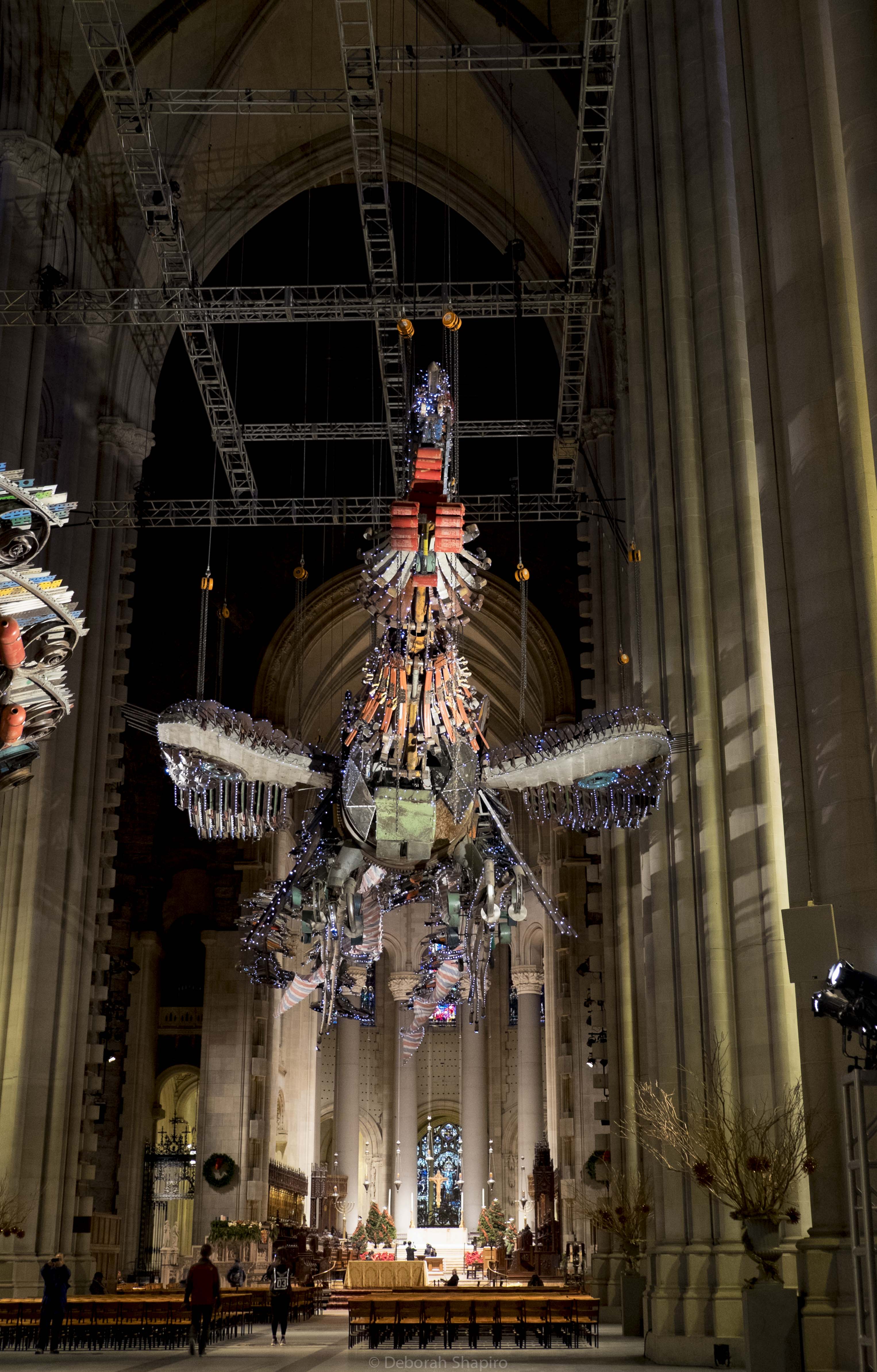 An amazing sight: two monumental, soaring sculptures of the mythical birds high above the nave of the Cathedral of St. John the Divine in Morningside Heights. They were made out of discarded construction materials (such as pipes, wheels, gas canisters, hard hats) in Beijing by the Chinese artist Xu Bing. If you live in or near New York, you have until the end of February 2015 to see this installation.