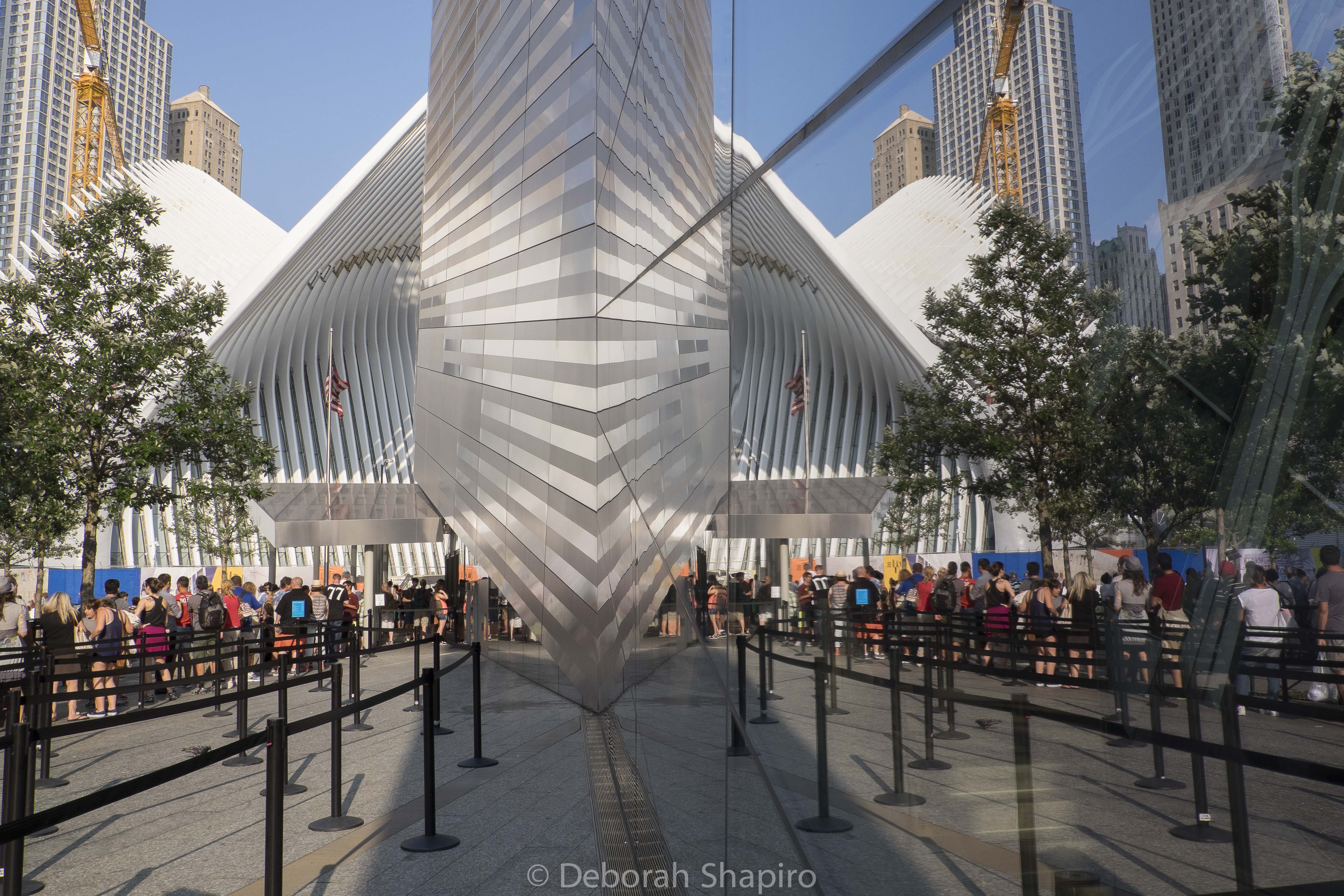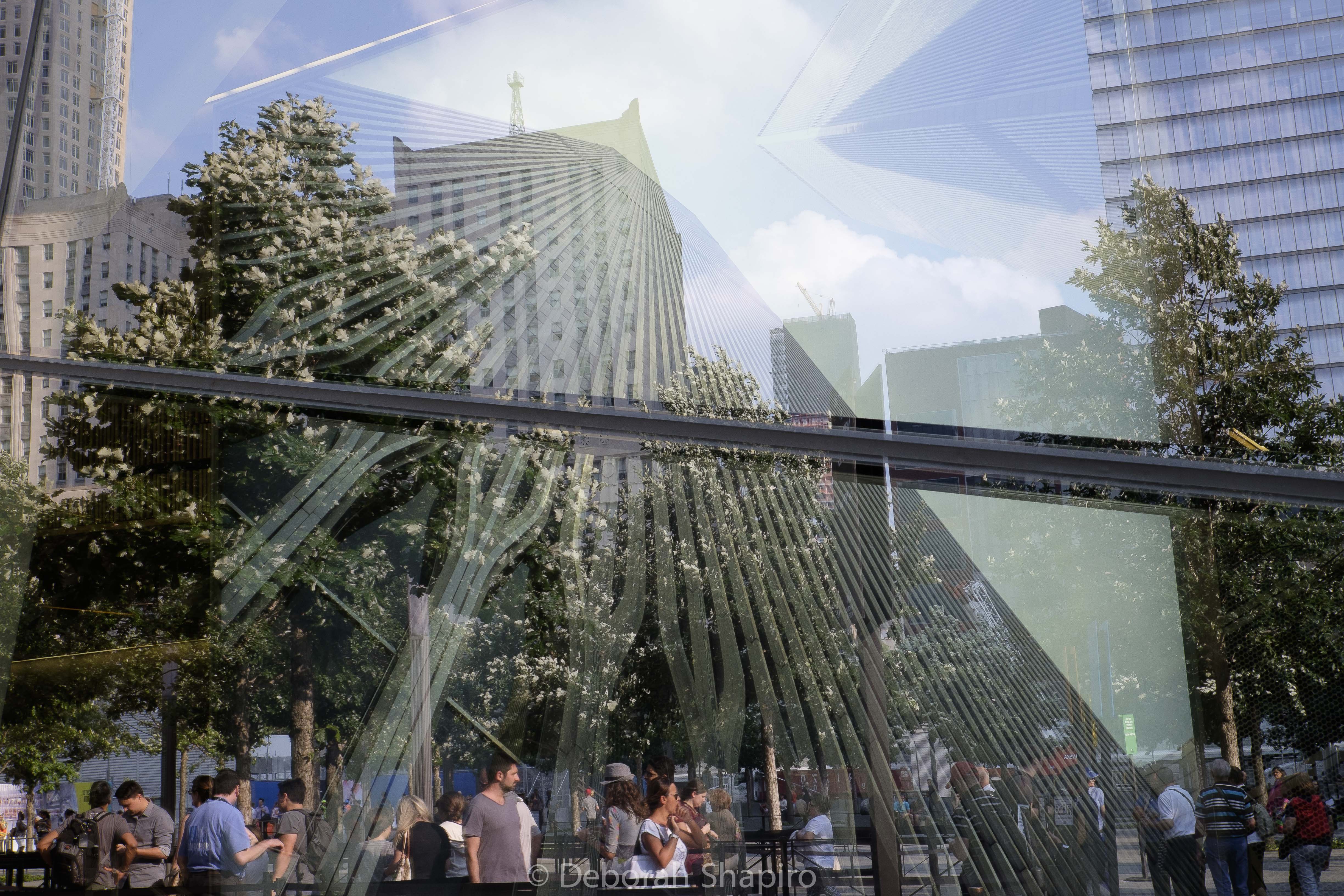 A photograph of the facade of the old World Trade Center reaches for the sky