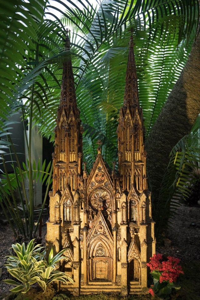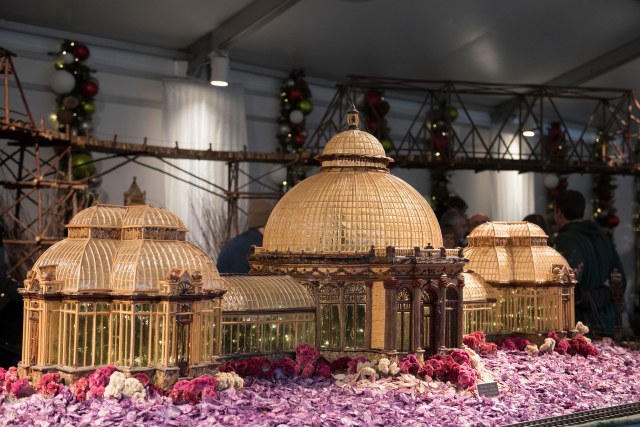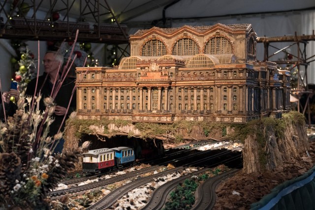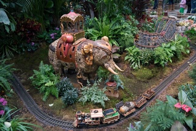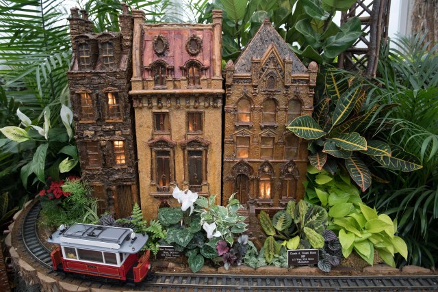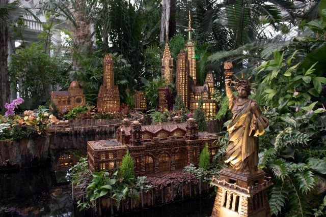 A tour of New York City’s iconic landmarks as you’ve never seen them: the delightful Holiday Train Show at the New York Botanic Garden. All of the historic buildings and surroundings are constructed from natural materials including wood, leaves, lichens, and bark. Long demolished buildings like the old Penn Station were reconstructed from archival photographs, and trains of all kinds wind in and out of the model cityscape.
