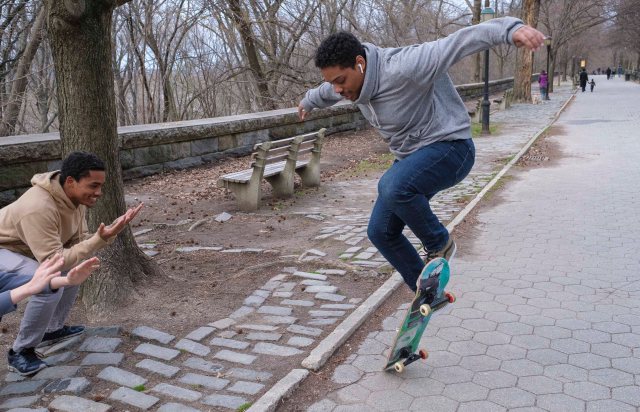 High school kids skateboarding on Riverside Drive, Friday, March 13. School attendance had plummeted  to 68% that day as gatherings of over 500 people were banned due to the coronavirus. The schools were still open but parents pulled their children out and teachers threatened to stay home in protest. The next day, the mayor announced that the New York City school system would close on Monday, March 16.