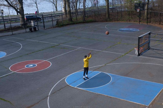 A solitary basketball player shooting hoops in Riverside Park on April 1. Gyms were closed and group sports were banned.