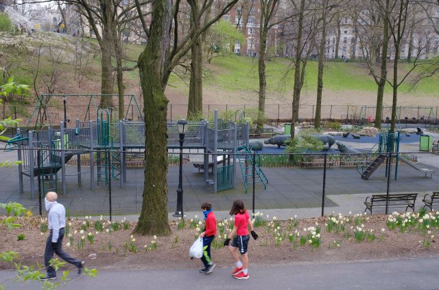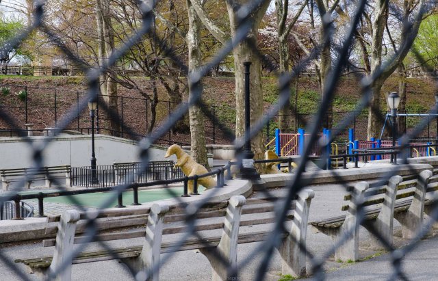 April 2: Playgrounds were open at first after the schools closed, but people failed to observe social distancing procedures so the playgrounds were closed by order of the city. This is Dinosaur Park in Riverside Park at 97th Street.