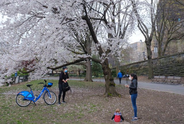 April 5: social distancing under the flowering cherry trees in Riverside Park.