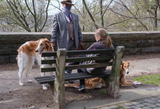 April 19: The Borzoi people on Riverside Drive. The man is dressed up for Orthodox Easter.