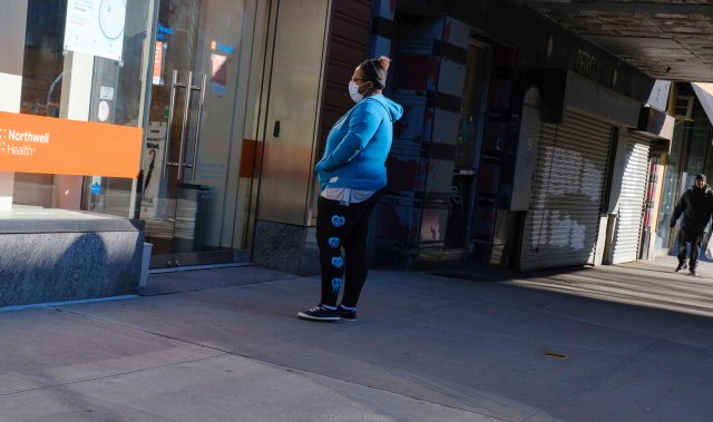 April 22: Waiting to enter an urgent care on Broadway and 99th Street. A row of skulls runs down the side of the woman’s tights.