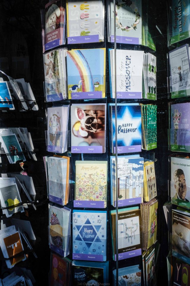April 22: Easter and Passover cards remained on display in the window of a closed stationery shop for weeks after the holidays. Easter services and Passover Seders were online only.