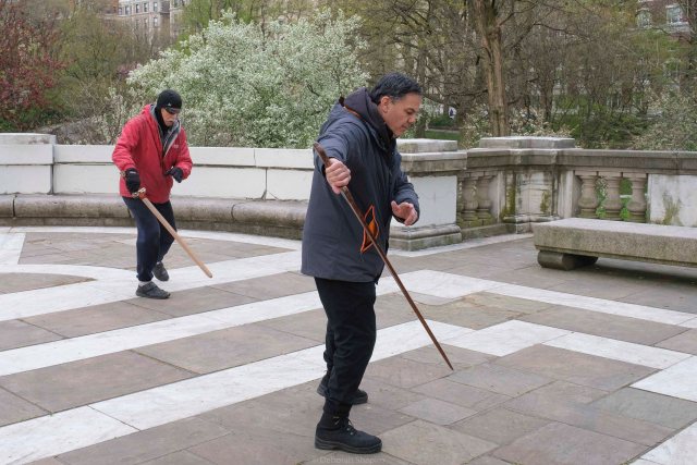 April 23: His school closed, a Tai Chi instructor (left) practiced a sword form with his student in Riverside Park.