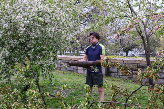 April 25: When the gyms are closed, people exercise with whatever comes to hand, like this branch from a pruned tree in Riverside Park.