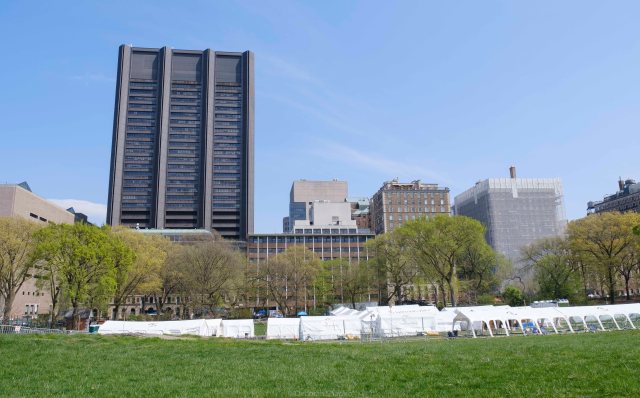 April 25: Across the street from the Mount Sinai Hospital buildings, a controversial evangelical disaster relief organization set up a field hospital  in Central Park to take care of patients when there was no longer room in the overwhelmed hospital. The hospital and New York City obtained assurances that all patients would be treated equally. Earlier in the pandemic there were often six ambulances lined up at a time waiting to deliver patients here, but on the day of this photo in late April no ambulances arrived within a half hour period.