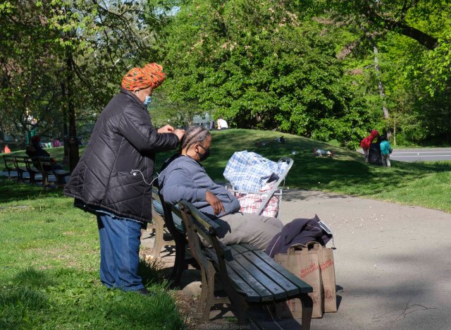May 12: With hair salons closed, enterprising stylists took their skills outdoors, like this woman braiding hair in Central Park.
