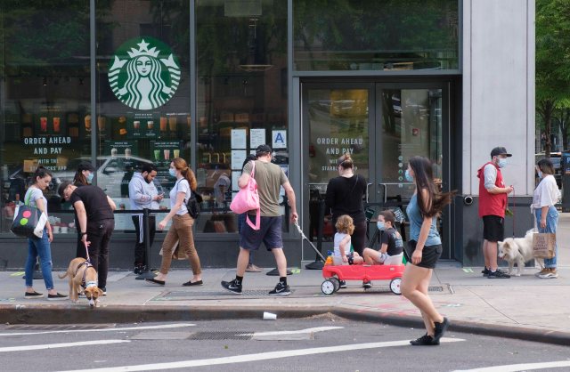May 28: Lining up for takeout at Starbucks on the corner of Columbus Avenue and 100th Street.