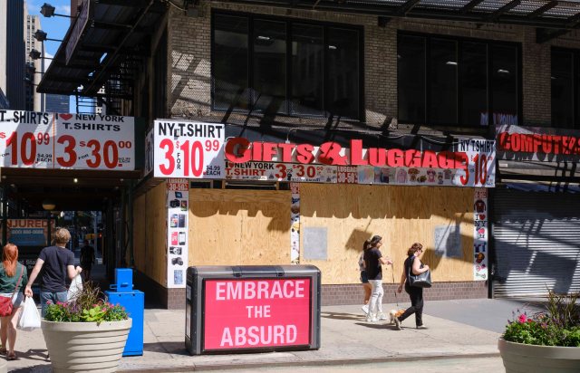 June 13: People waiting for takeout from a restaurant next door to a looted Yankees merchandise store on 42nd Street near Times Square.