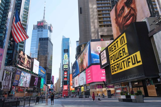 June 13: An empty Times Square, barricaded by the police and closed to the public to prevent demonstrators from entering. Businesses expressed solidarity with the Black Lives Matter movement and a flag flew at half staff to remember the lives lost in the pandemic.