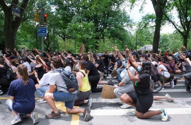 June 4: Protesters taking a knee on Fifth Avenue during their march.
