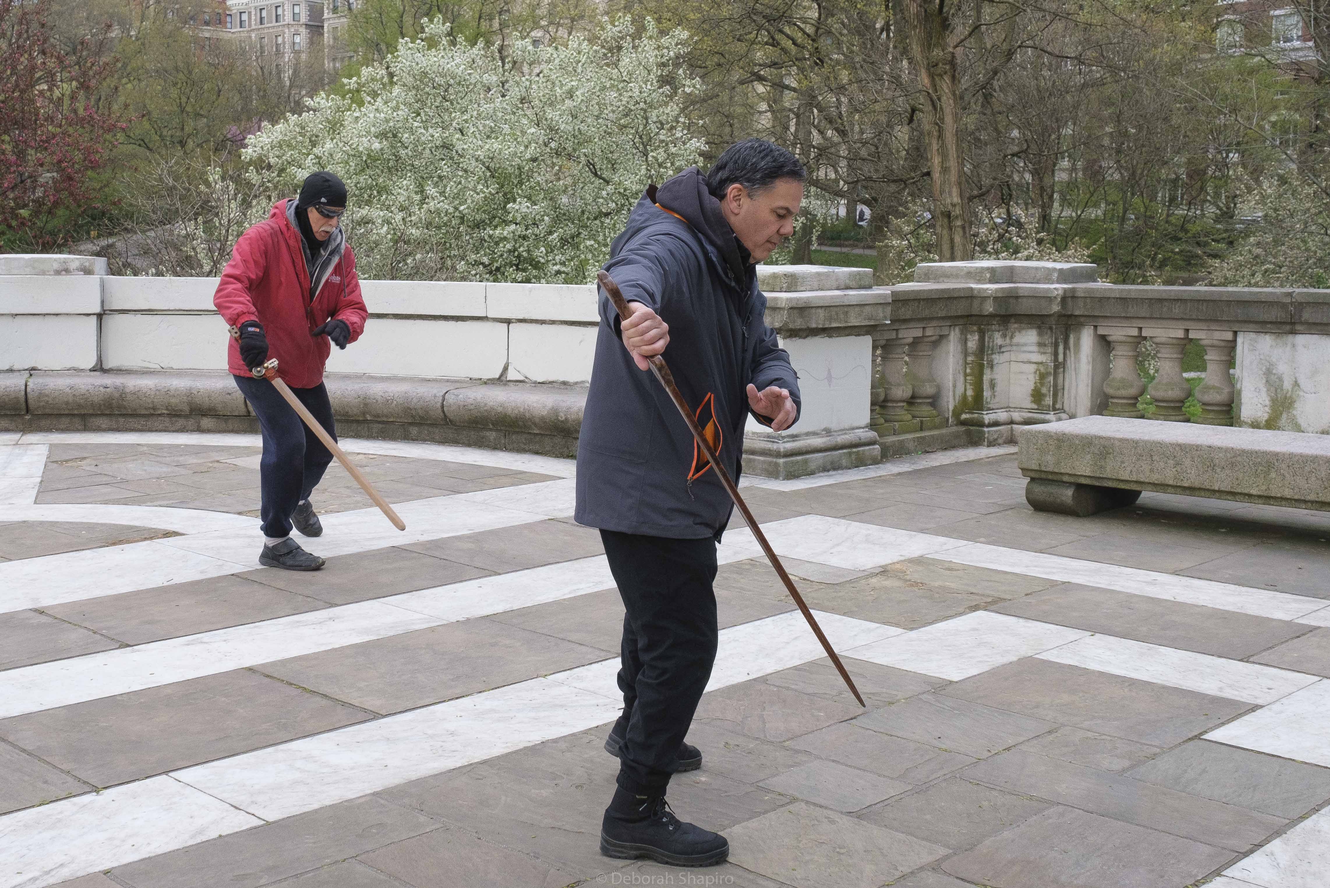 April 23: His school closed, a Tai Chi instructor (left) practicing a sword form in Riverside Park.