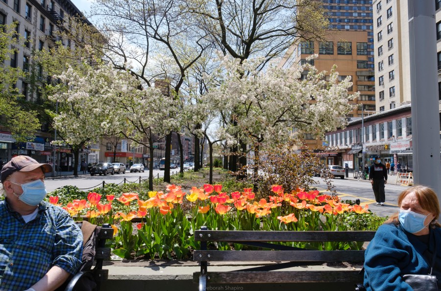 April 25: the photo that sums up Spring 2020. Flowers in bloom, empty streets, and people wearing masks and sitting six feet apart on Broadway.