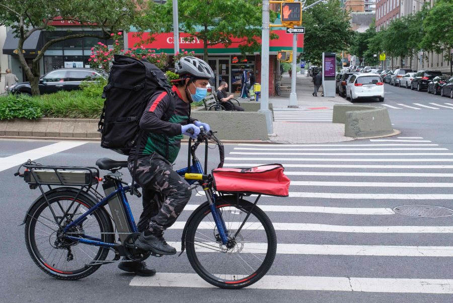 May 28: What you need to be a pizza delivery guy in New York City. Electric powered bike with extra battery. Two Kryptonite locks (one for the frame and front wheel, one for the rear wheel). Backpack. Pizza hot pack. Helmet. Gloves. Smartphone. Willingness to work for minimum wage, no health insurance or benefits, few tips, exposure to infection with deadly virus.