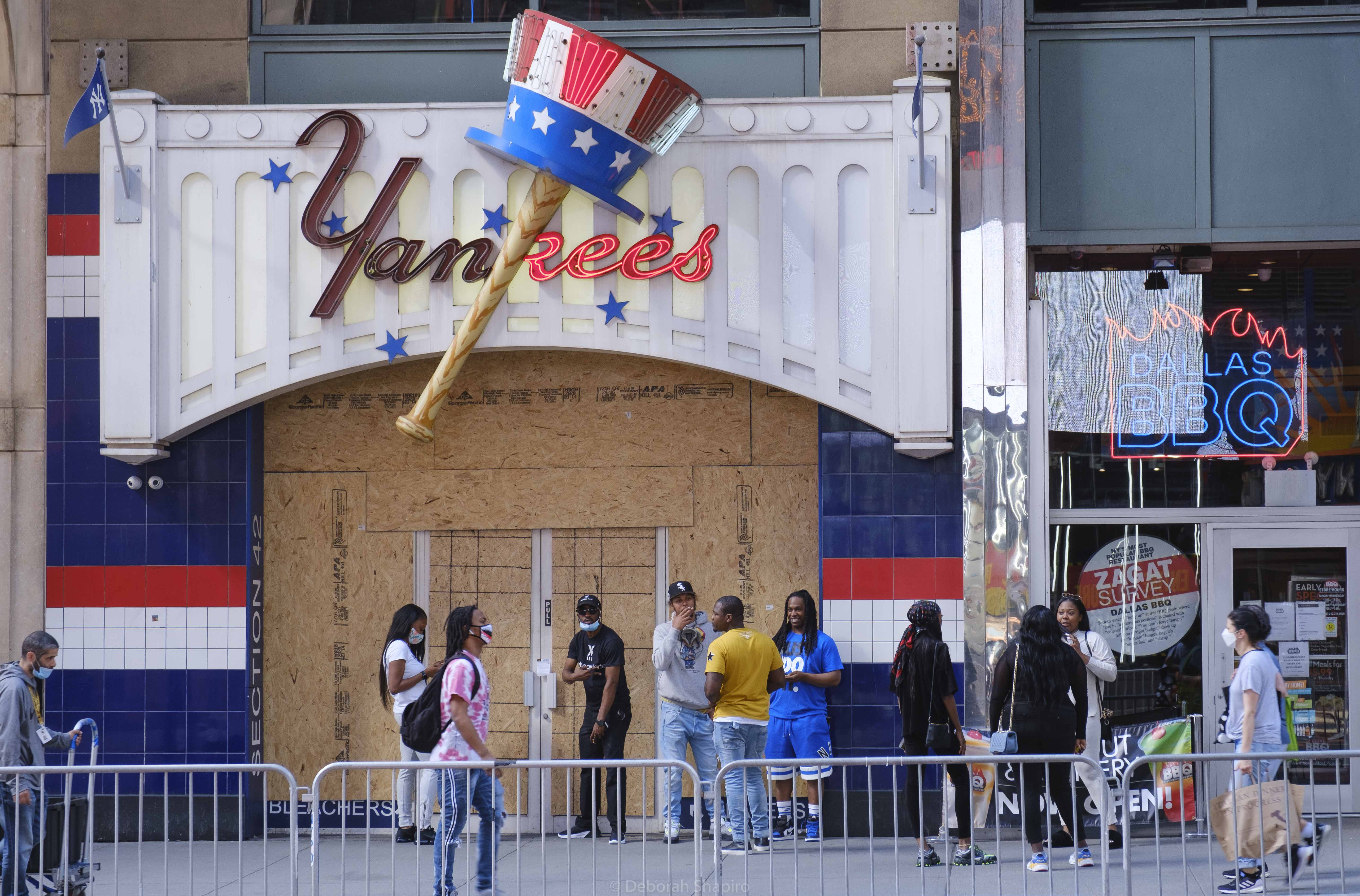 June 13: People waiting for takeout from a restaurant next door to a looted Yankees merchandise store on 42nd Street near Times Square.
