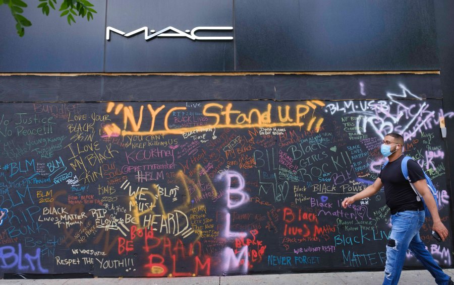 June 14: Plywood covering a store on 125th Street in Harlem is covered with graffiti.