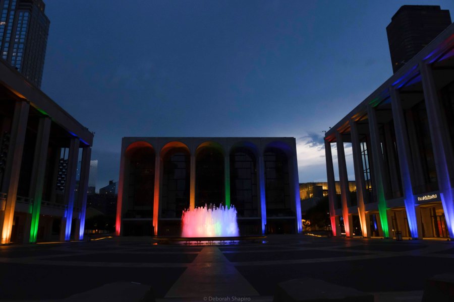 June 27: Lincoln Center Plaza with the iconic fountain illuminated in rainbow colors in honor of Pride Month. The Metropolitan Opera, Koch Theater, and David Geffen Hall have been dark since March and the plaza is closed and barricaded.