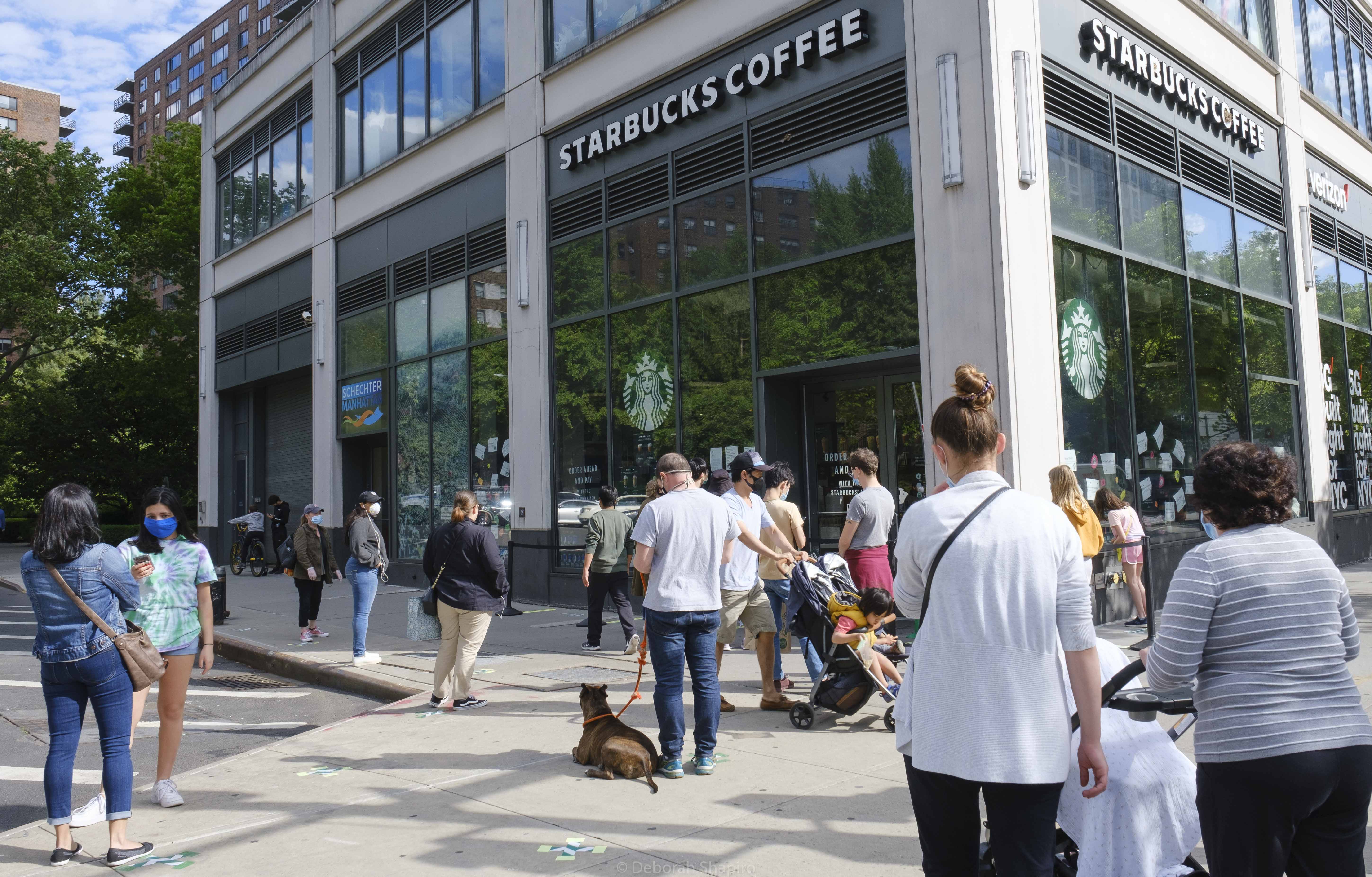 June 1: A Starbucks reopens for takeout on Columbus Avenue and people line up for lattes.