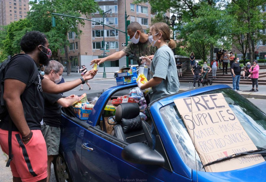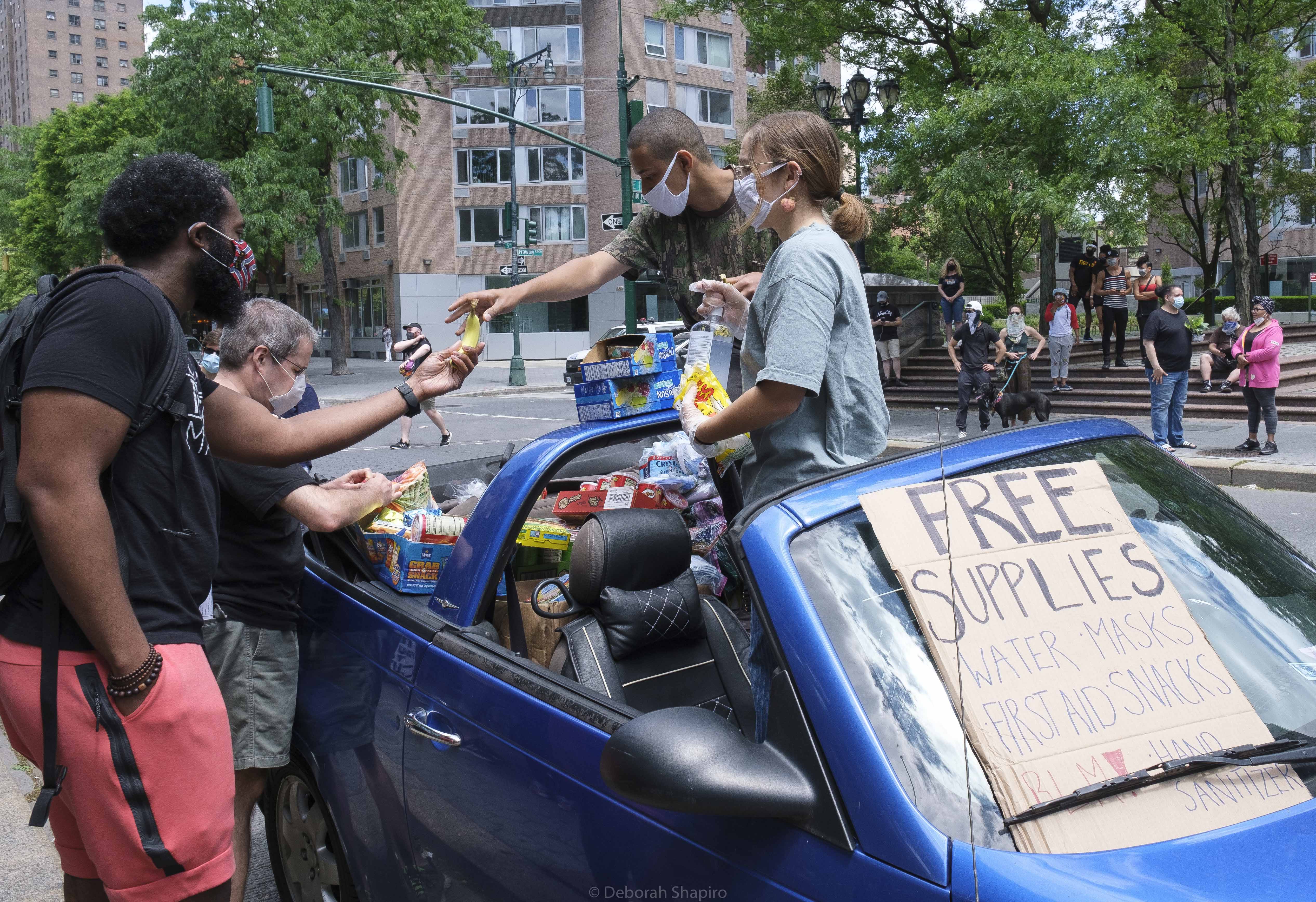 June 4: Volunteers handing out supplies to protesters in Harlem in preparation for their march to City Hall.