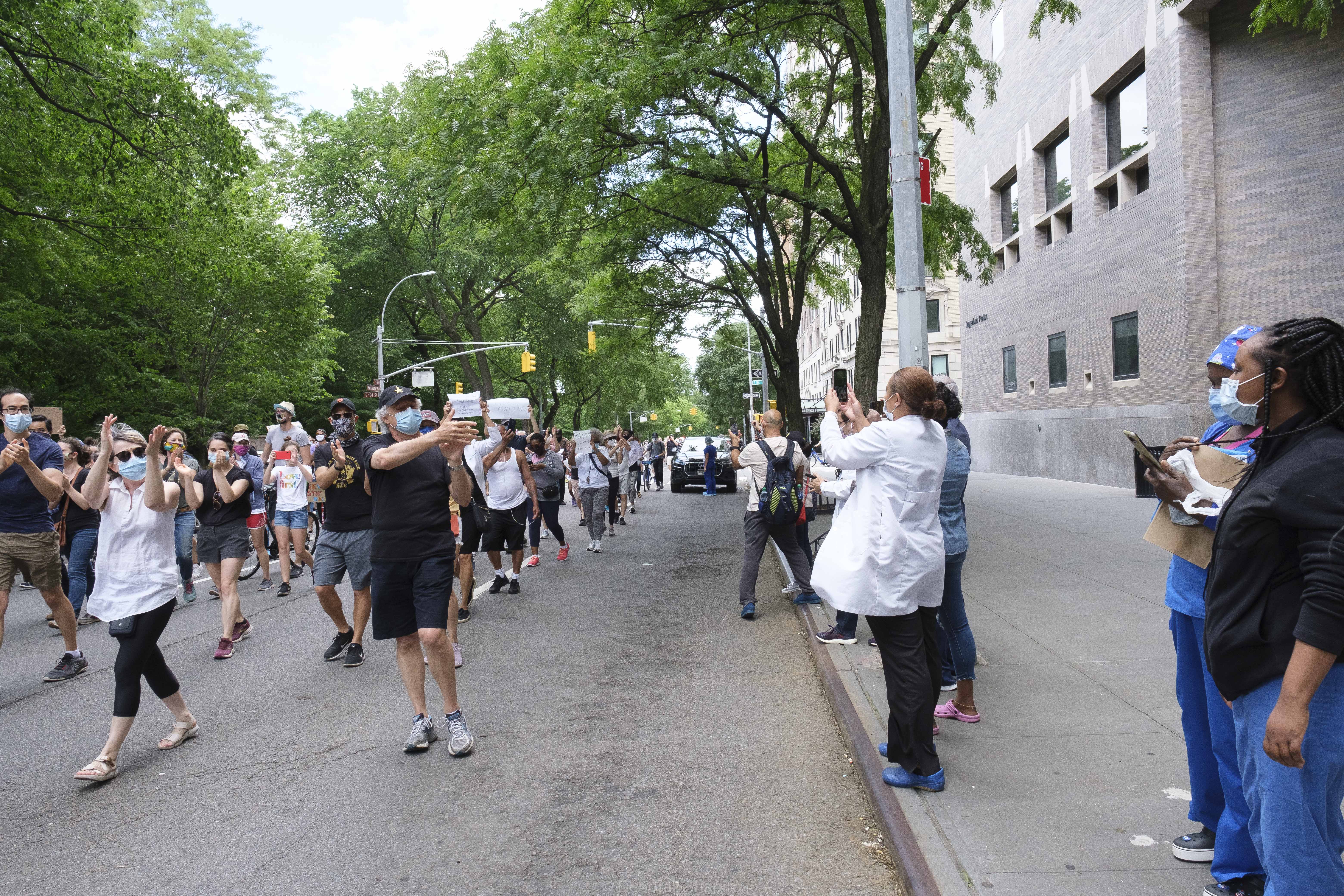 June 4: Protesters and Mount Sinai Hospital workers applaud each other on 5th Avenue