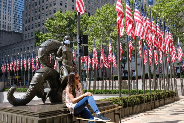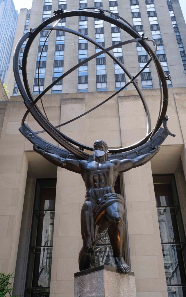 Rockefeller Center, July 4. All the statues at Rockefeller Center are wearing masks as a reminder.