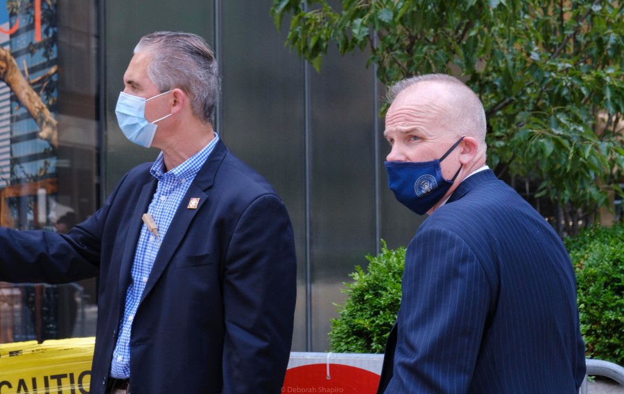 Trump Tower security man in a surgical mask (left), Secret Service agent in a mask with the presidential seal worn under the nose (right)