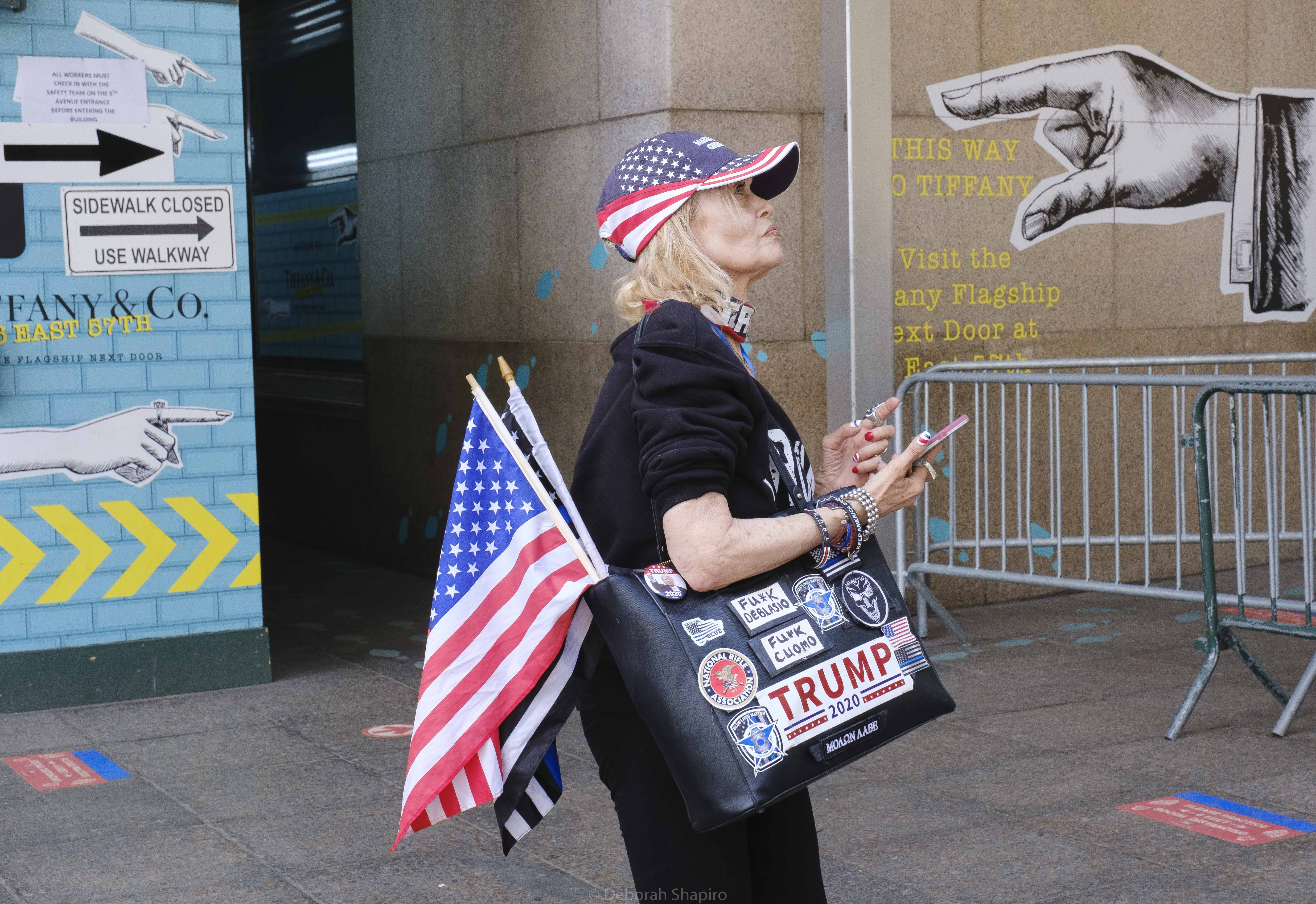 July 12: Hedy, a Trump supporter, on Fifth Avenue near Trump Tower before a demonstration.