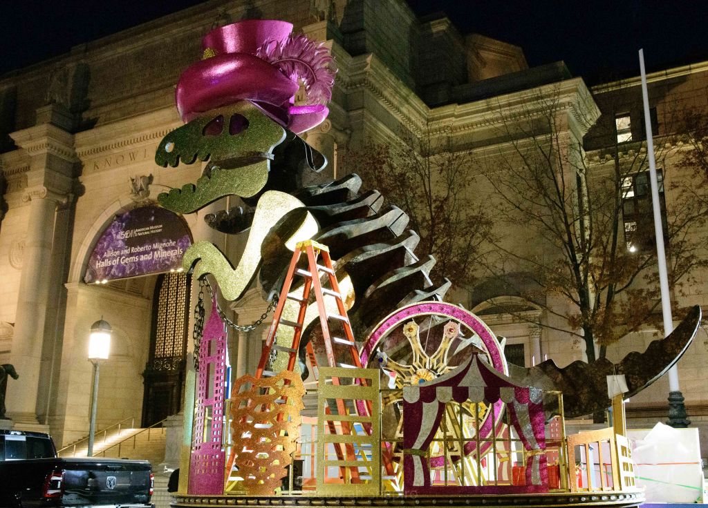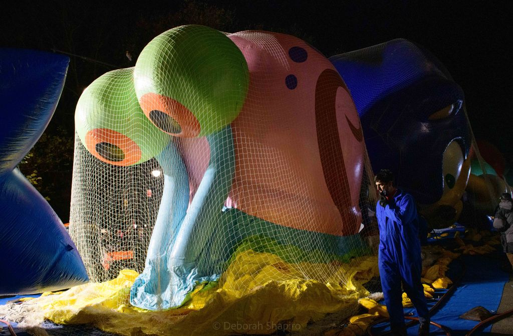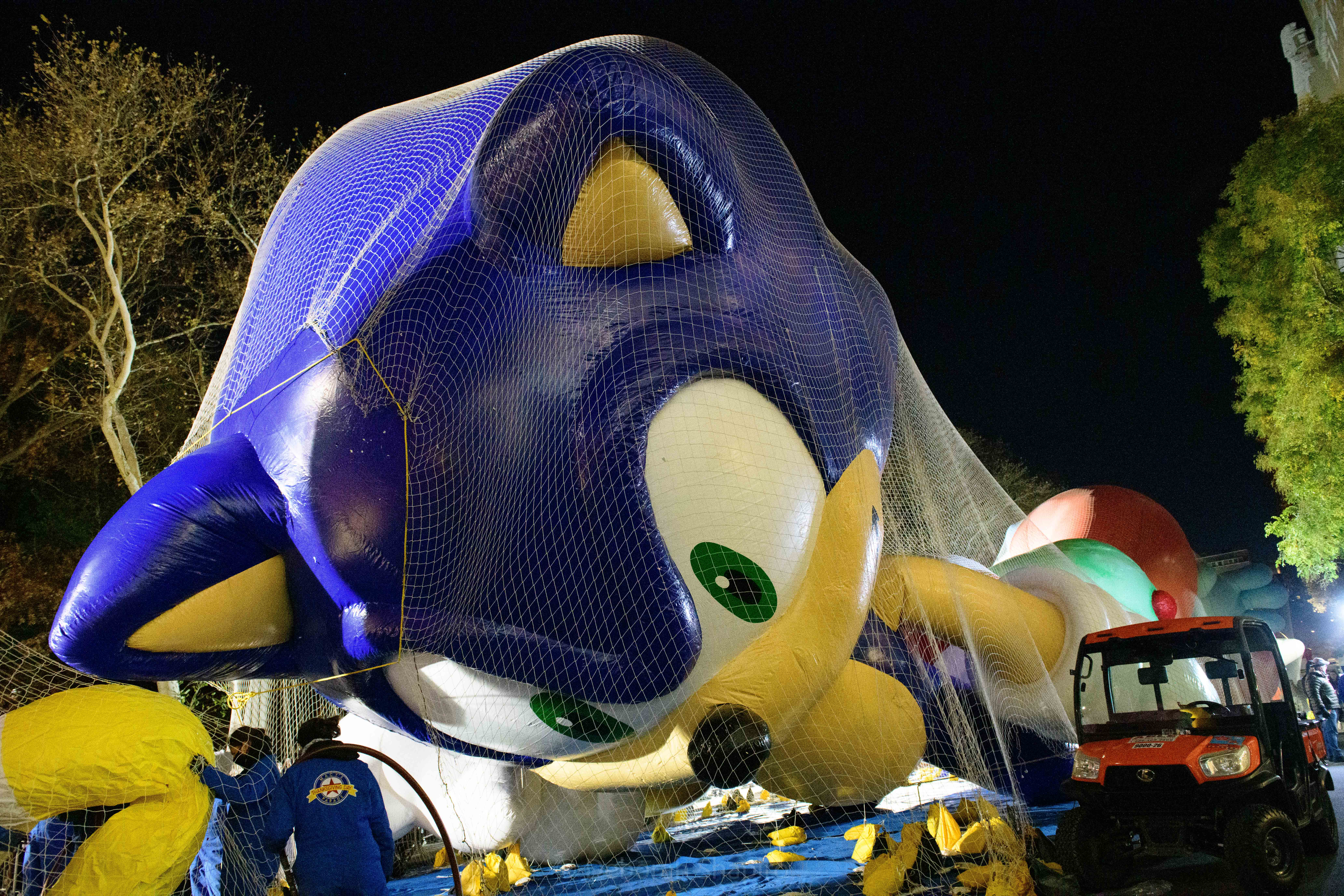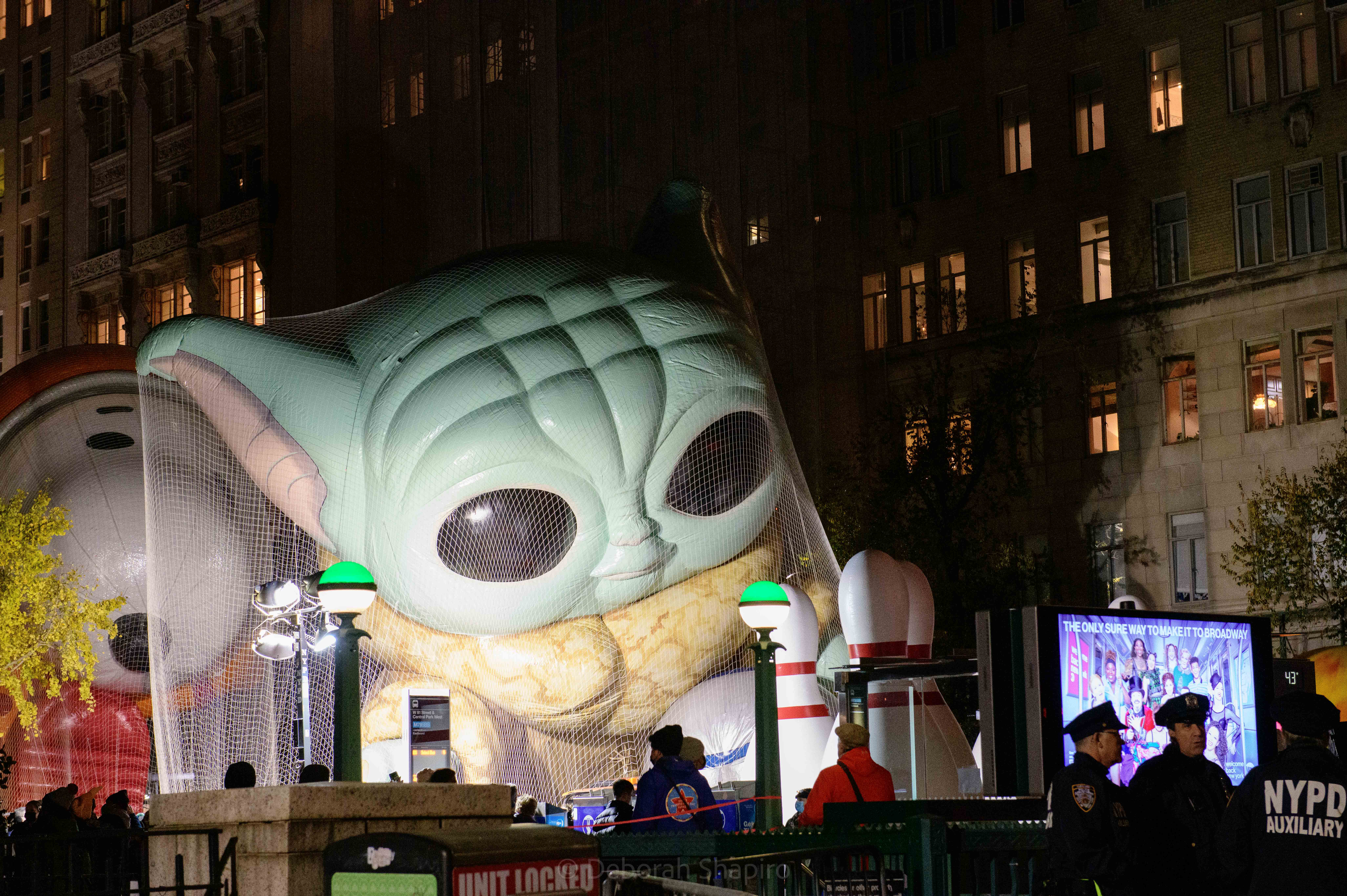 Once fully inflated, the balloons are held down with nets and sandbags.The quintessential turkey awaits the start of the paradeThe Jolly Green GiantThere’s a Tyrannosaurus rex inside the American Museum of Natural History just inside that door.Baby Yoda on West 81st StreetInflating a balloon with helium. A large crew works all day to prepare and secure the balloons.TeamworkSonic the Hedgehog inflated and ready to goGary, the snail from SpongeBob SquarePants, and a Macy’s crew member showing the scale. The man is well over 6 feet tall.