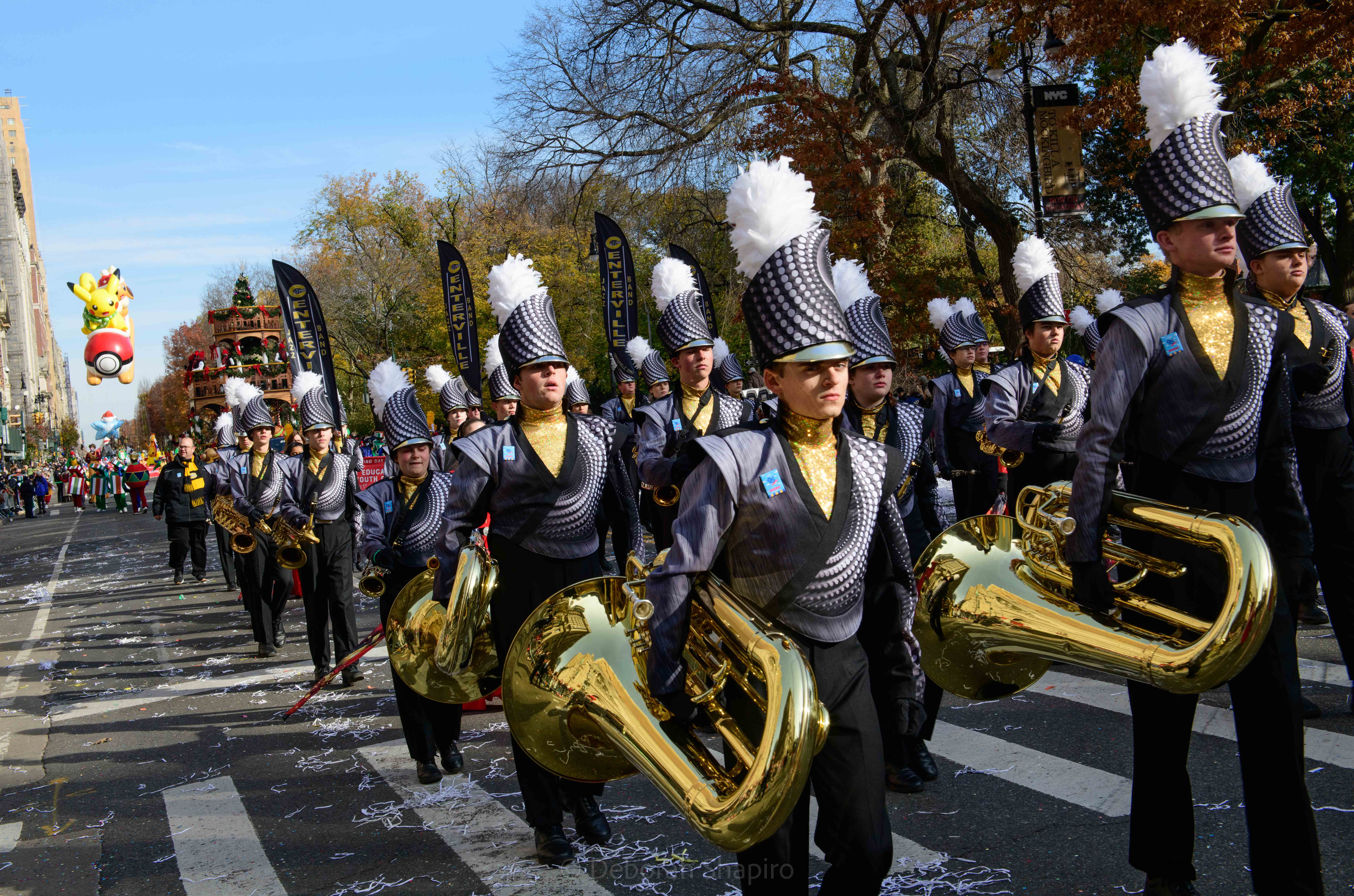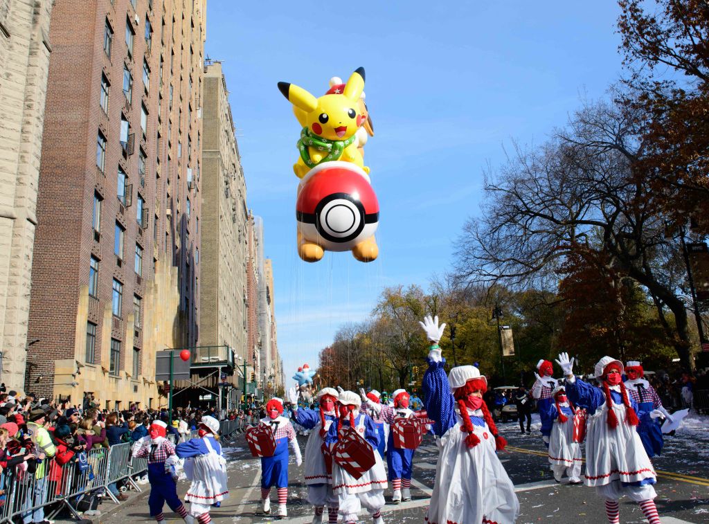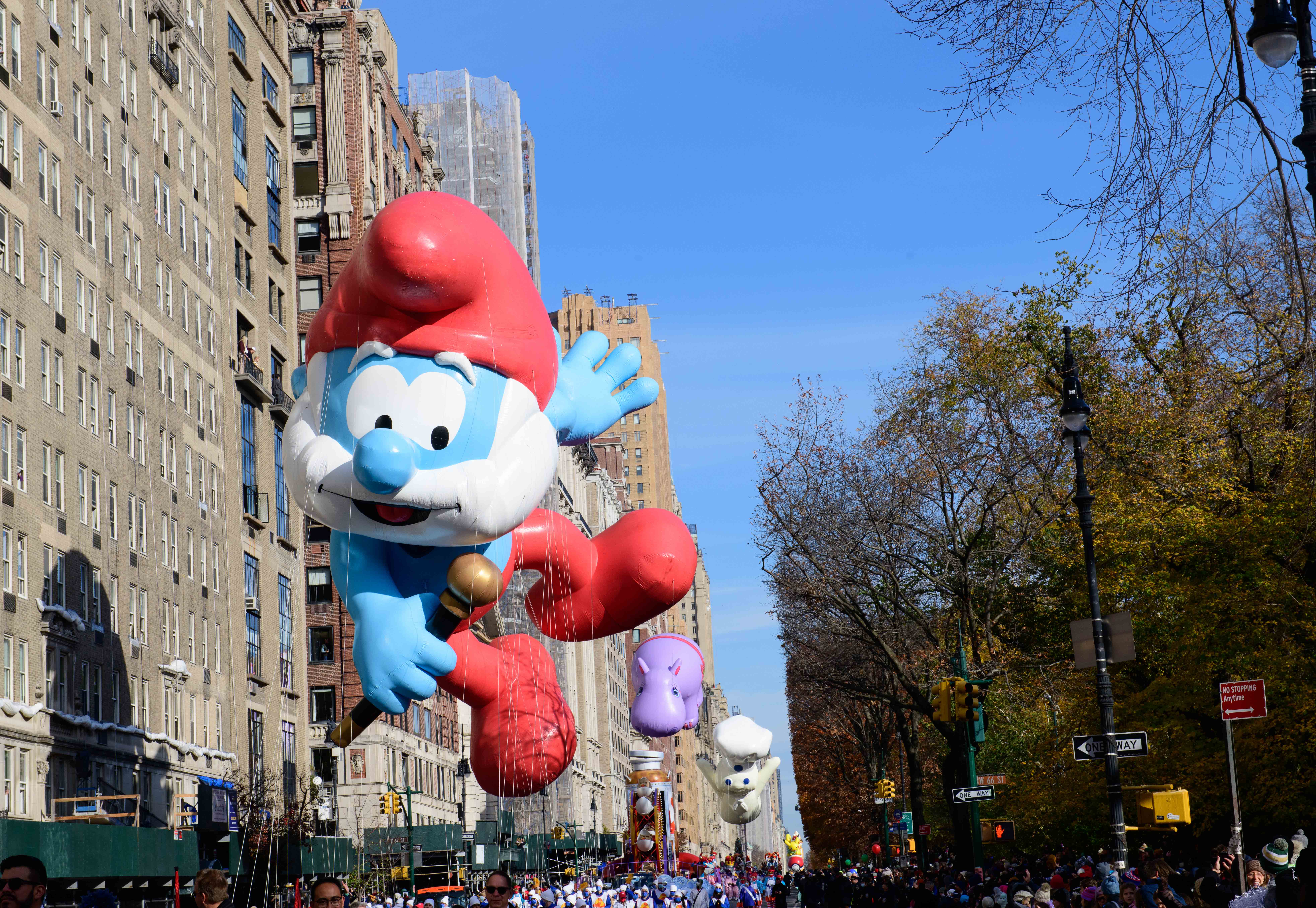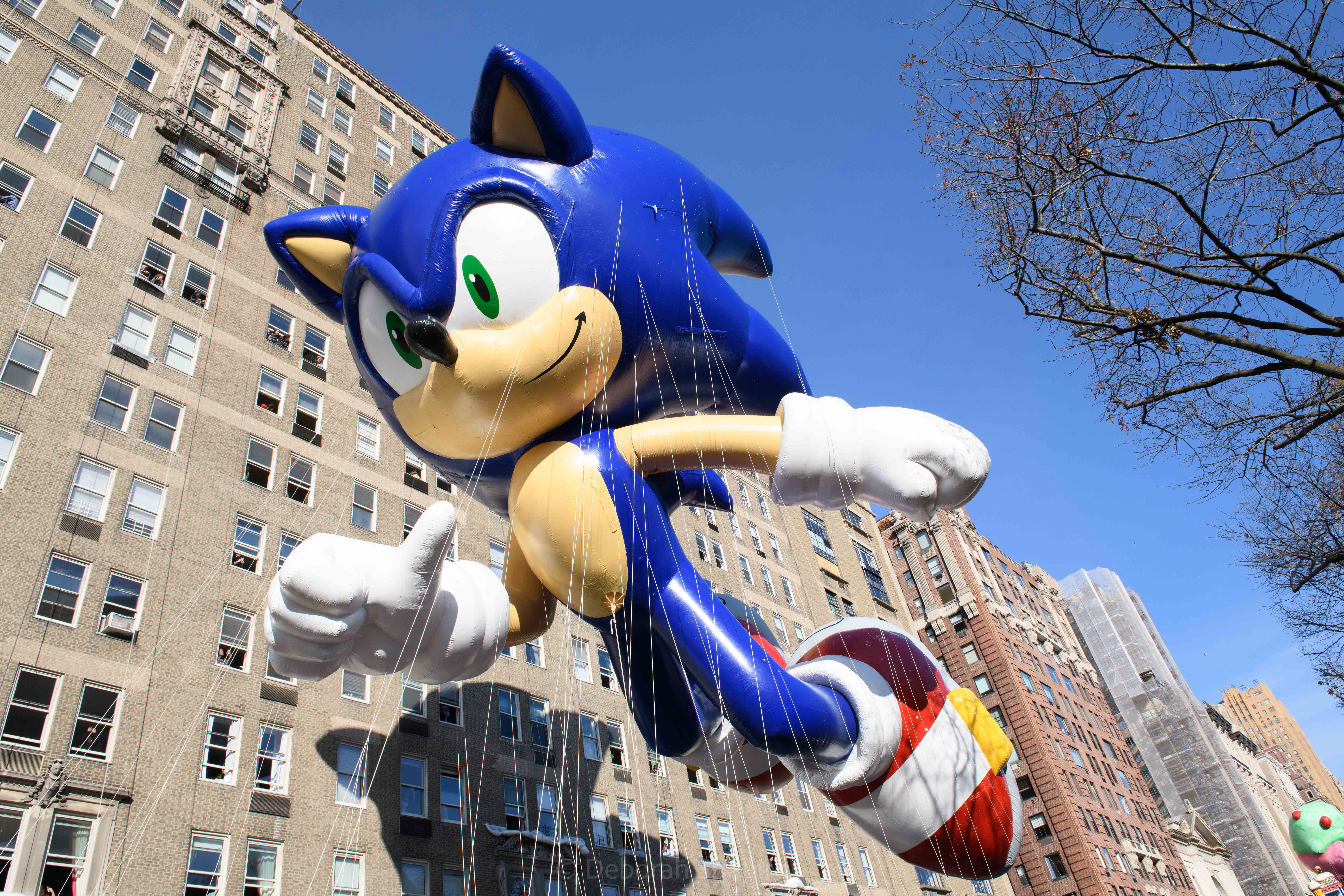 Goku, an anime superhero, flying over Central Park WestBaby Yoda The balloons are enormous, like the Sponge Bob balloon at rear which is almost 3 stories tallSonic the HedgehogThe buildings on Central Park West are reflected in the instruments of this high school marching band from Centerville, Ohio PikachuThey spotted the singer Kelly Rowland and they were overjoyedPapa Smurf, the Happy Hippo, and the Pillsbury Doughboy make their way down Central Park West Enjoying the parade outside Central Park