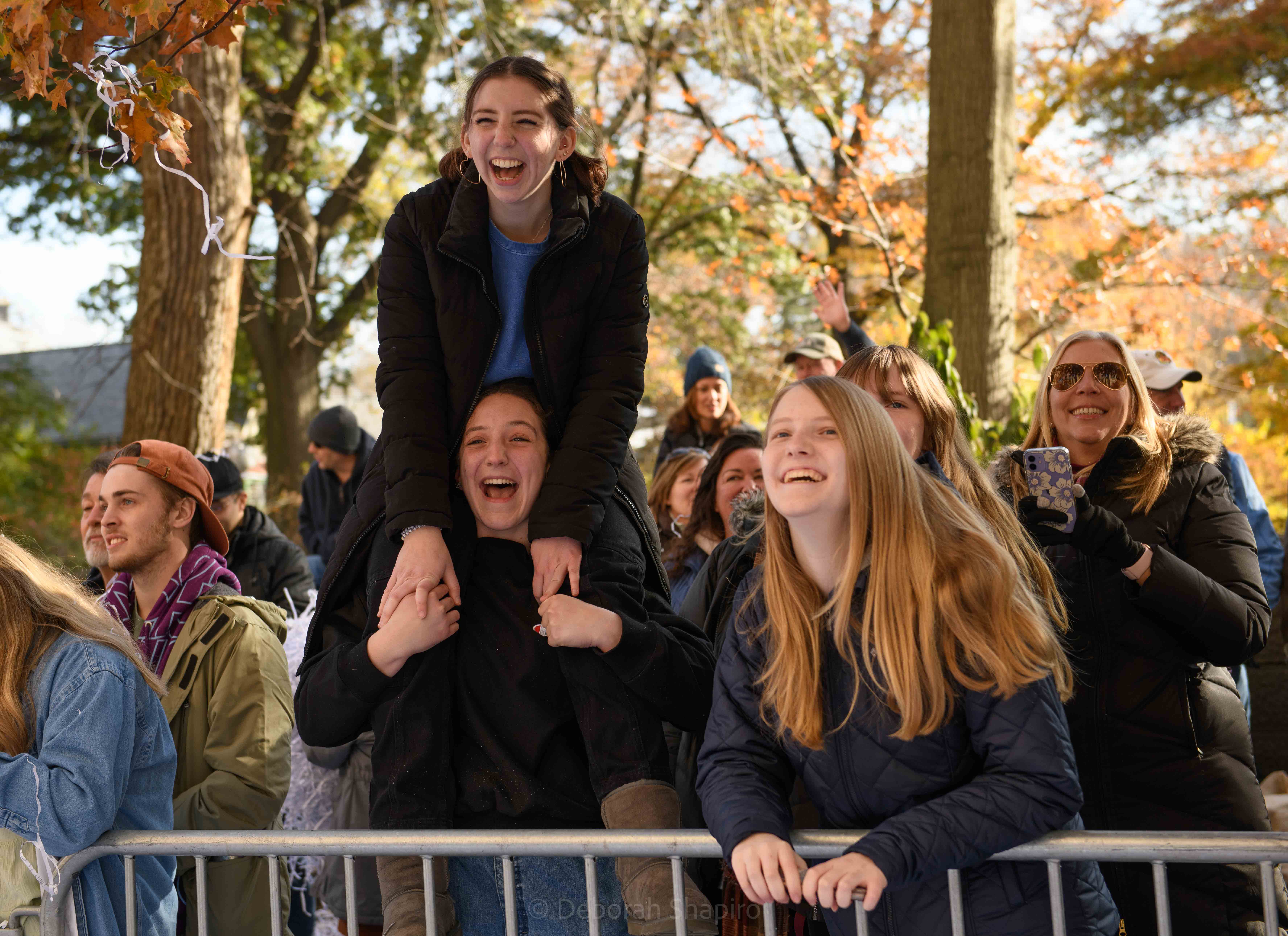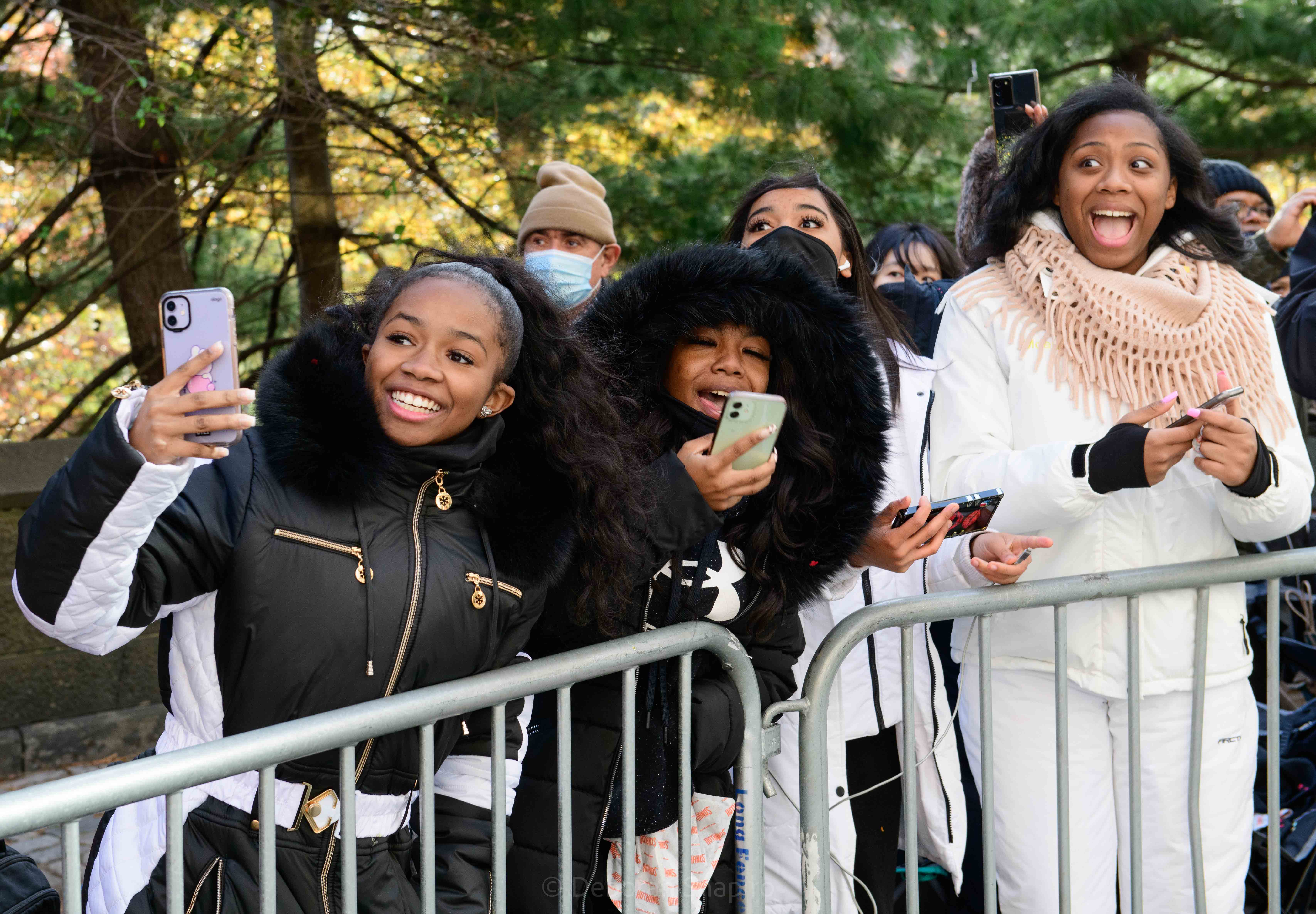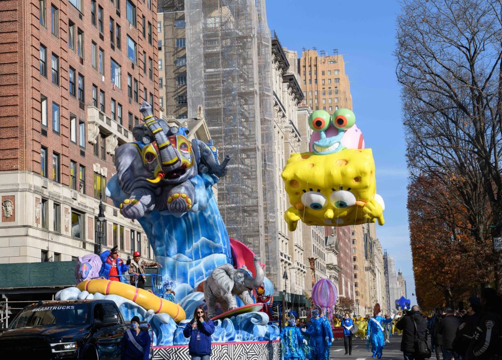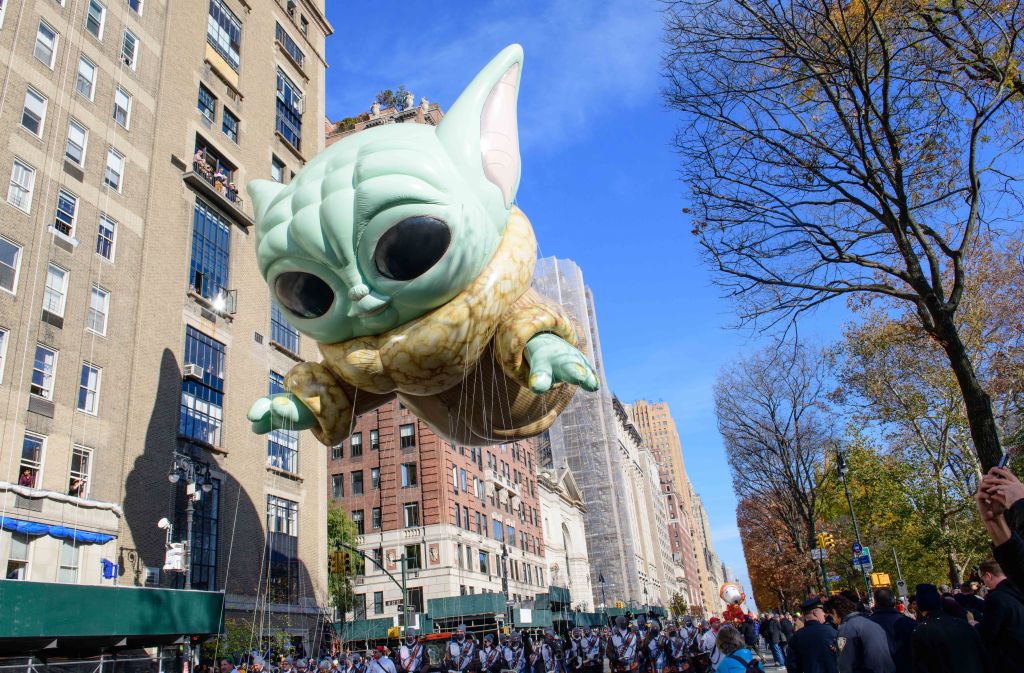 Goku, an anime superhero, flying over Central Park WestBaby Yoda The balloons are enormous, like the Sponge Bob balloon at rear which is almost 3 stories tallSonic the HedgehogThe buildings on Central Park West are reflected in the instruments of this high school marching band from Centerville, Ohio PikachuThey spotted the singer Kelly Rowland and they were overjoyedPapa Smurf, the Happy Hippo, and the Pillsbury Doughboy make their way down Central Park West Enjoying the parade outside Central Park