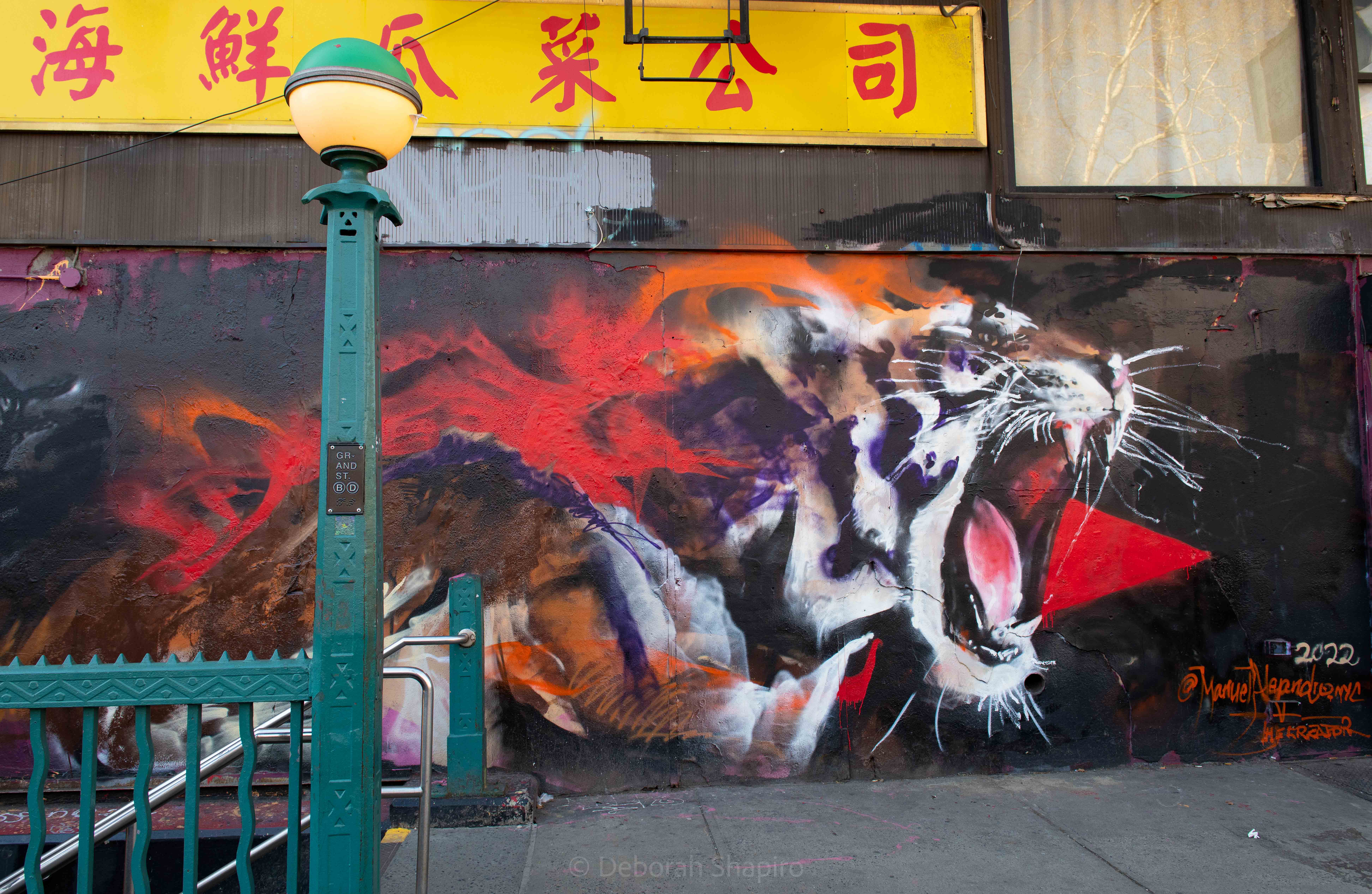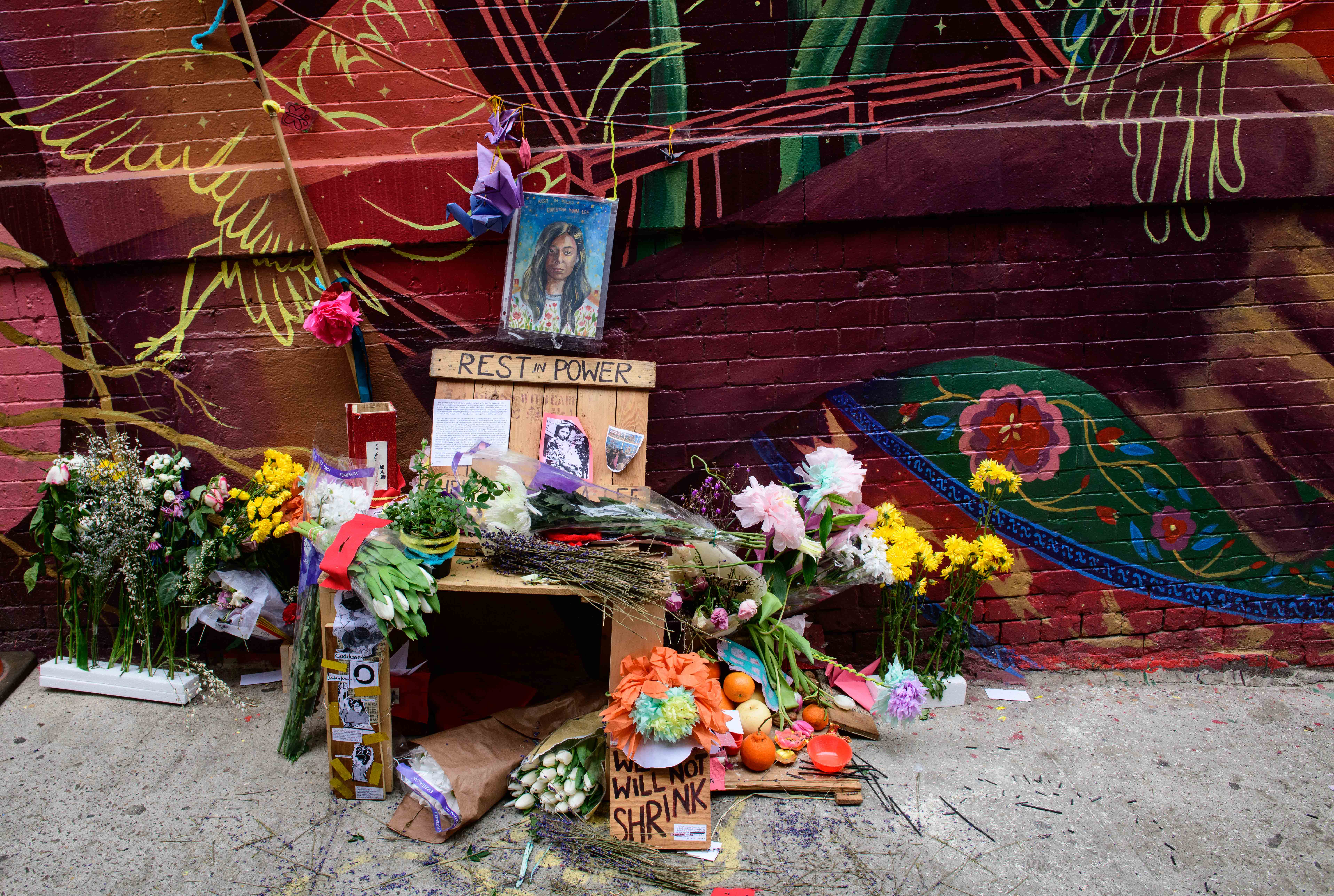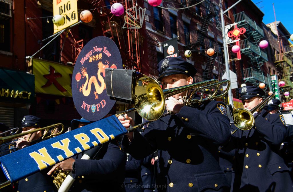 The NYPD Marching Band led the parade down Mott StreetLion dancersThe youngest drummer Drums and cymbals accompany the lion dancersPeople give the lion dancer a traditional New Year gift of money in a red envelopeThe dragon passes under the Manhattan BridgeSenator Chuck Schumer marches in the parade every yearProtesters opposing the placement of homeless shelters and a large jail in ChinatownA sidewalk memorial to Christina Yuna Lee, murdered in her apartment by a homeless man who followed her from the streetA mural by Manuel Alejandro depicts a tiger that seems to be emerging from the subway