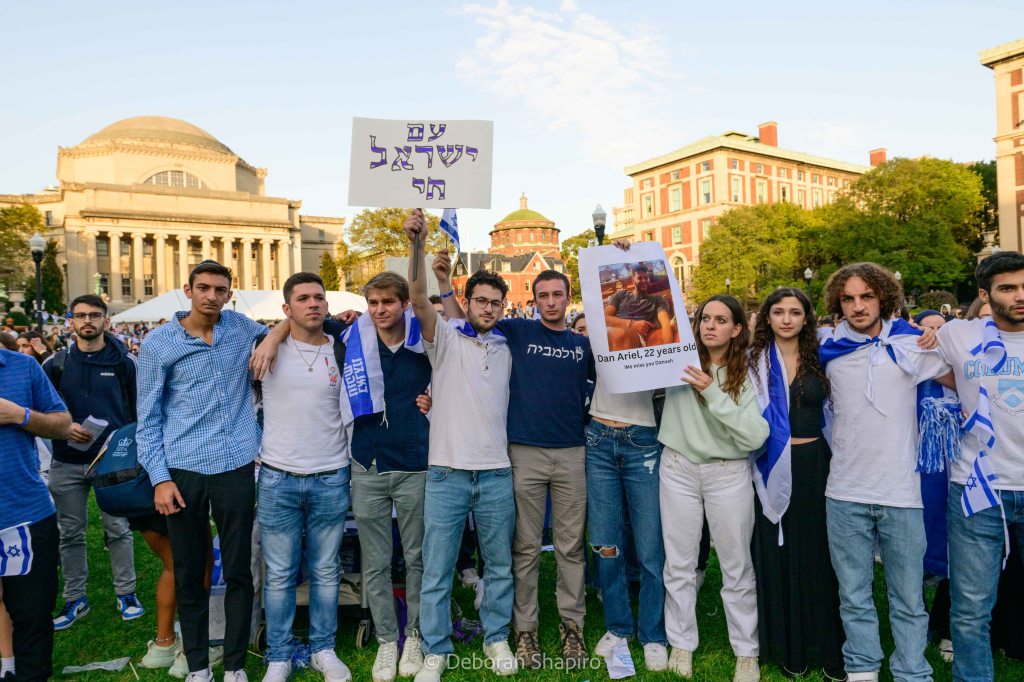 The sign says “Israel still lives.” Other students hold a photo of a man kidnapped or killed during the Hamas invasion of Israel on October 6.