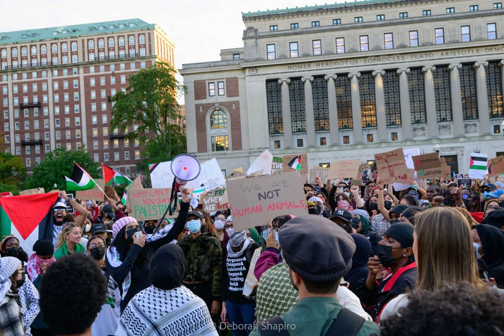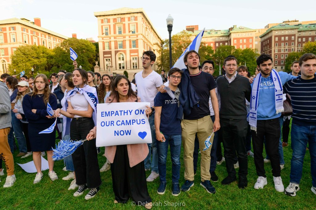 On Thursday, October 12 starting at 6 AM, the entire Columbia University campus was closed to anyone not presenting a Columbia ID at the gates following the invasion of Israel by Hamas and the announcement of protests. In the afternoon two opposing protests were held under tight security. Butler Lawn in front of Butler Library was divided into a protest organized by Columbia Students for Justice in Palestine and a protest on the other side of the lawn by Students Supporting Israel at Columbia University on the other side, separated by campus security and police. The two protests were peaceful but could not have been more different. See the captions under the photos.