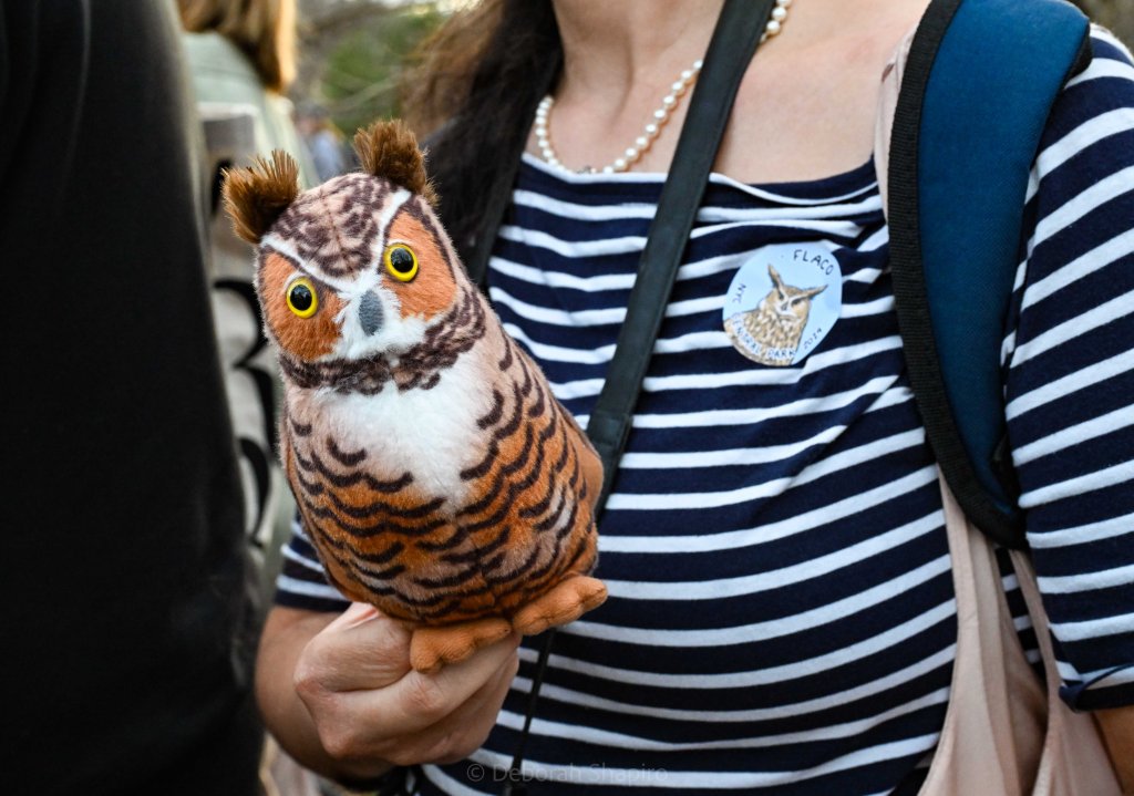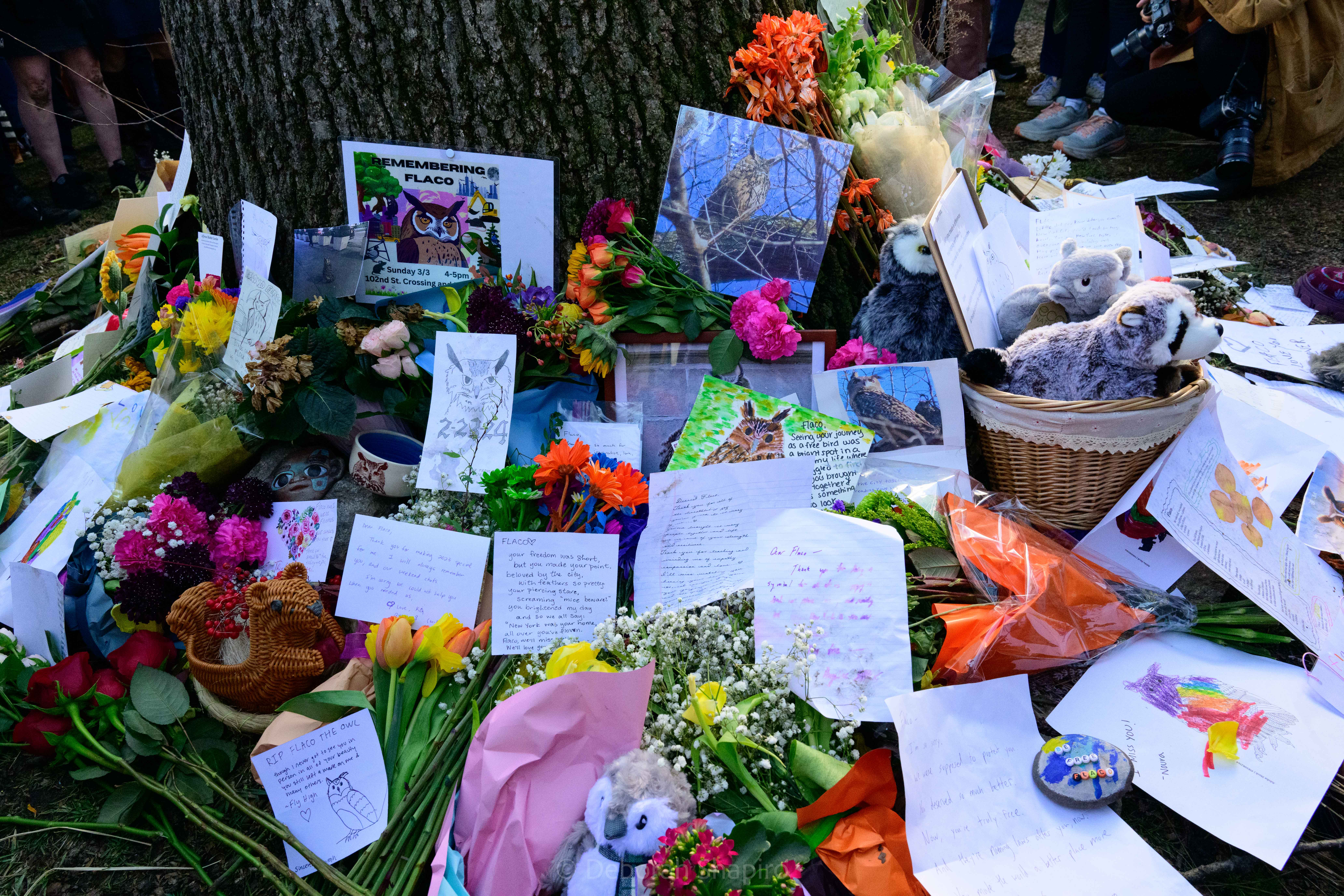 The story sped around the world. A male Eurasian Eagle-owl named Flaco, bred in captivity and confined in a small cage in the Central Park Zoo for the first thirteen years of his life, was suddenly freed when a vandal sneaked into the zoo at night and cut the wire on his cage. At first the drama centered on whether he would be recaptured, but he eluded nets and traps set by zoo workers. Then the city held its breath for a week until Flaco hunted and killed his first rat, proving that he was capable of survival outside the zoo. Controversy raged in New York about whether the zoo was to blame for his escape and whether he should remain free. He was a weak flier at first and crashed into branches as members of the New York birding community followed him day and night. Soon he became a confident and strong flier and a competent hunter, and the city fell in love with him. His story was captivating: a caged bird somehow becoming free and learning to survive on his own. For one year, expert photographers like David Lei, Jacqueline Emery, Anke Frohlich, and others documented Flaco’s behavior and habits. But the city is a hostile environment for birds in general and raptors like owls in particular, and after spending an entire year as a free bird, Flaco abruptly crashed into a building and was found dead on the ground. The city mourned. A memorial at one of his favorite trees in Central Park on Sunday, March 4 attracted hundreds of mourners who left tributes around the tree and heard from speakers. Children’s drawings and letters, heartfelt letters from adults inspired by his story, flowers, stuffed owls, and votive candles surrounded the tree. The ceremony was live-streamed around the world and covered by local media, all for one beloved and unique owl.
