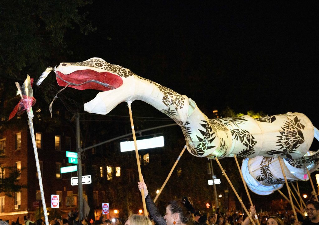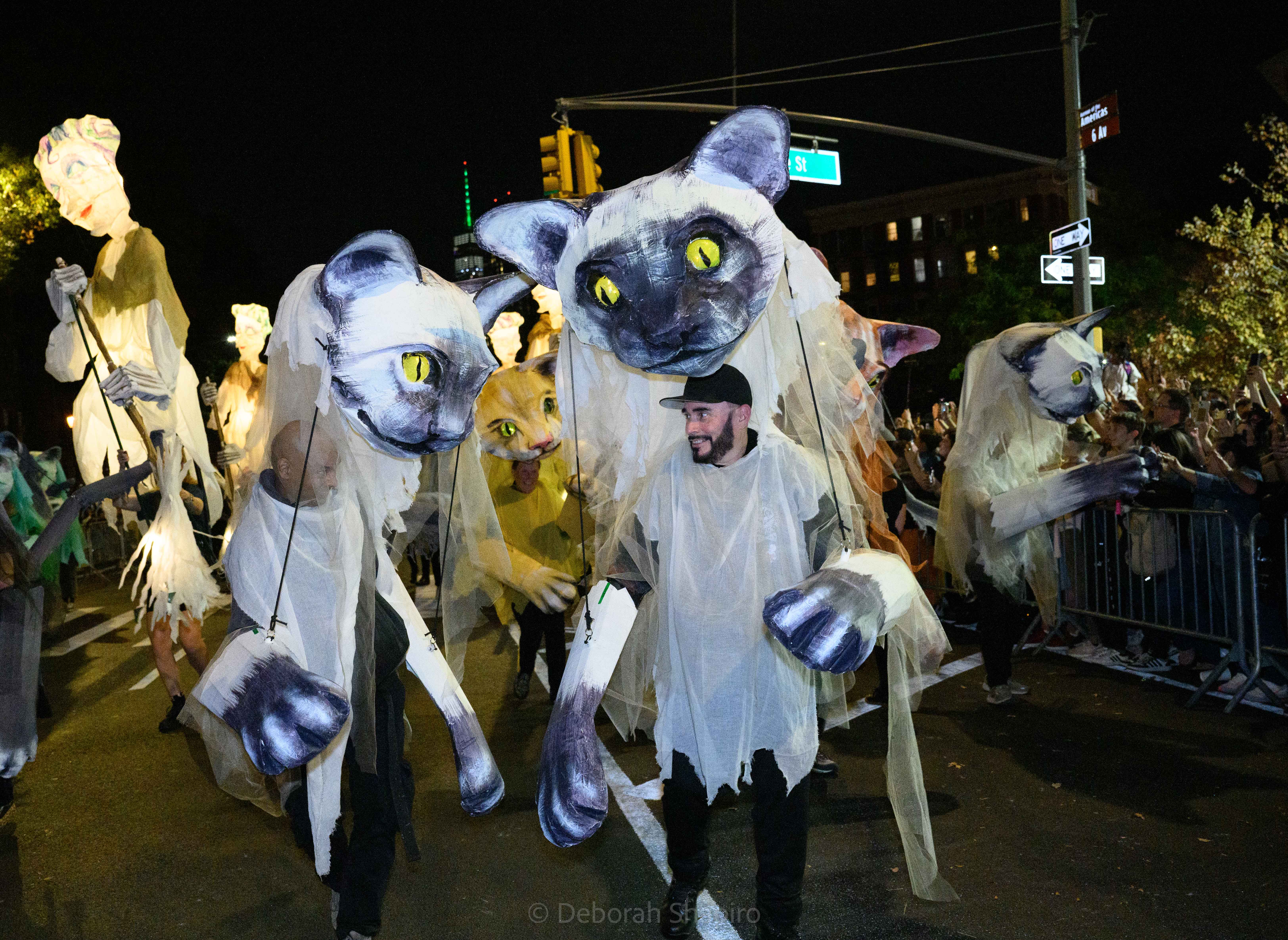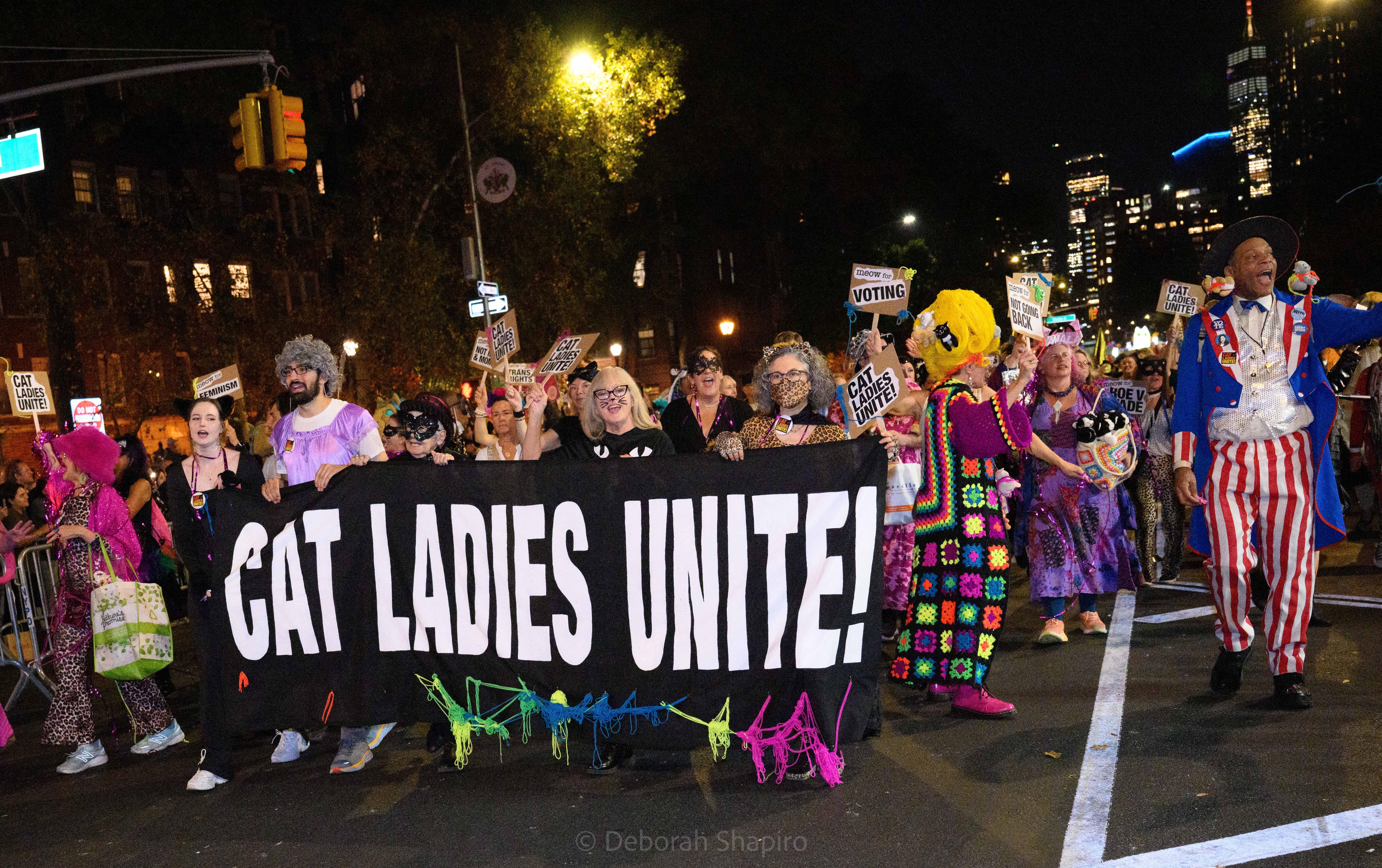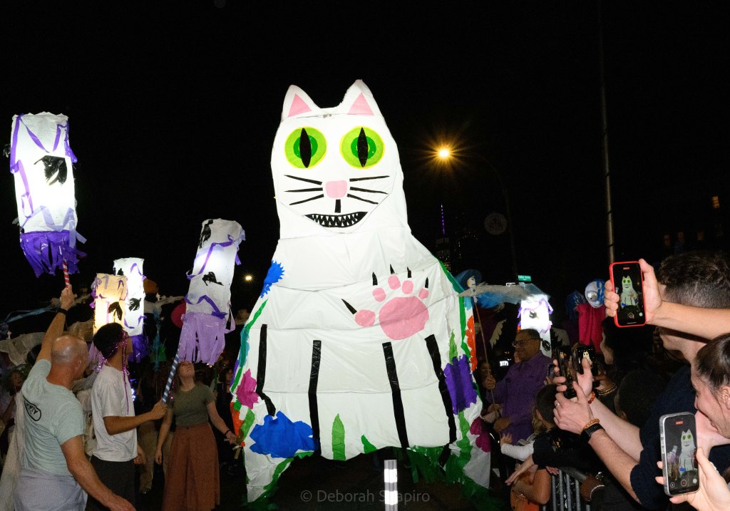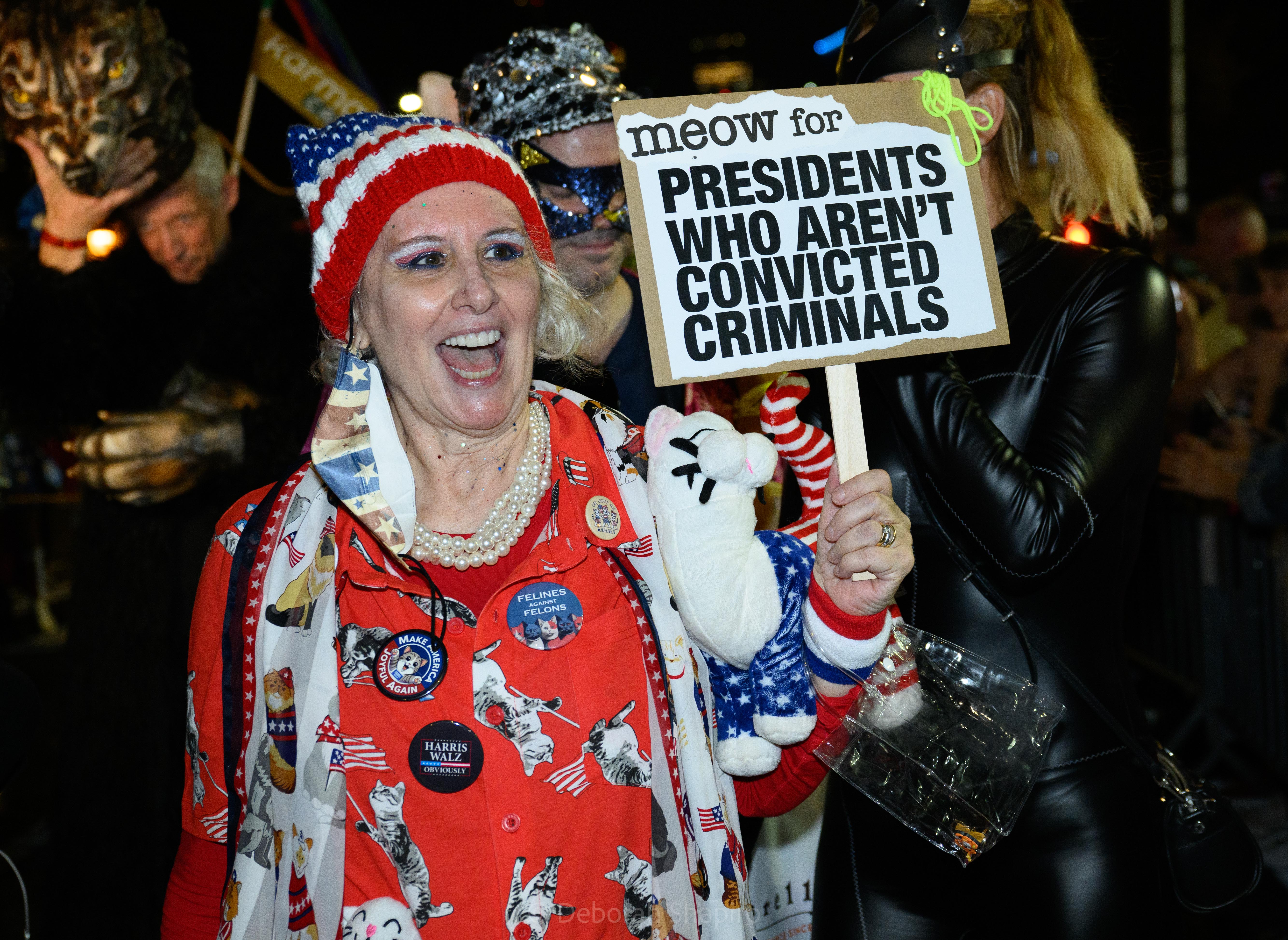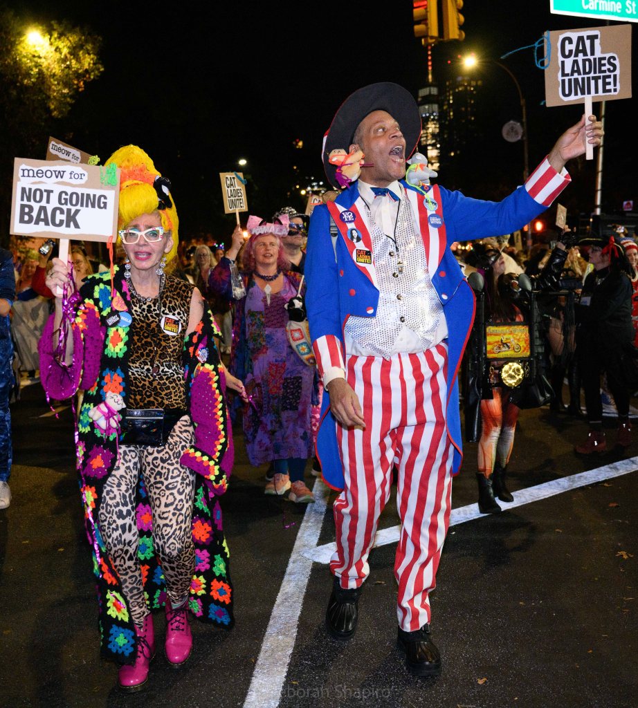 There was an award for best costume and I would have voted for this one.Cyclops meets MedusaThe parade moves up Sixth Avenue with the World Trade Center in the background A dog in a pizza shark costume was outnumbered by catsCat puppets march up Sixth AvenueA pink pussycatThis snake marionette appears every year and slithers fastThere was much satire directed at JD Vance’s “childless cat ladies” commentWith the presidential election in 5 days, political expression ran highThis Harris-Walz supporter was cheered by the spectatorsOne of the better caricature costumes More of the cat themeShe’s better dressedCats and cat pictures on the spectators’ phonesHalloween fell on a school night so no homework was done
