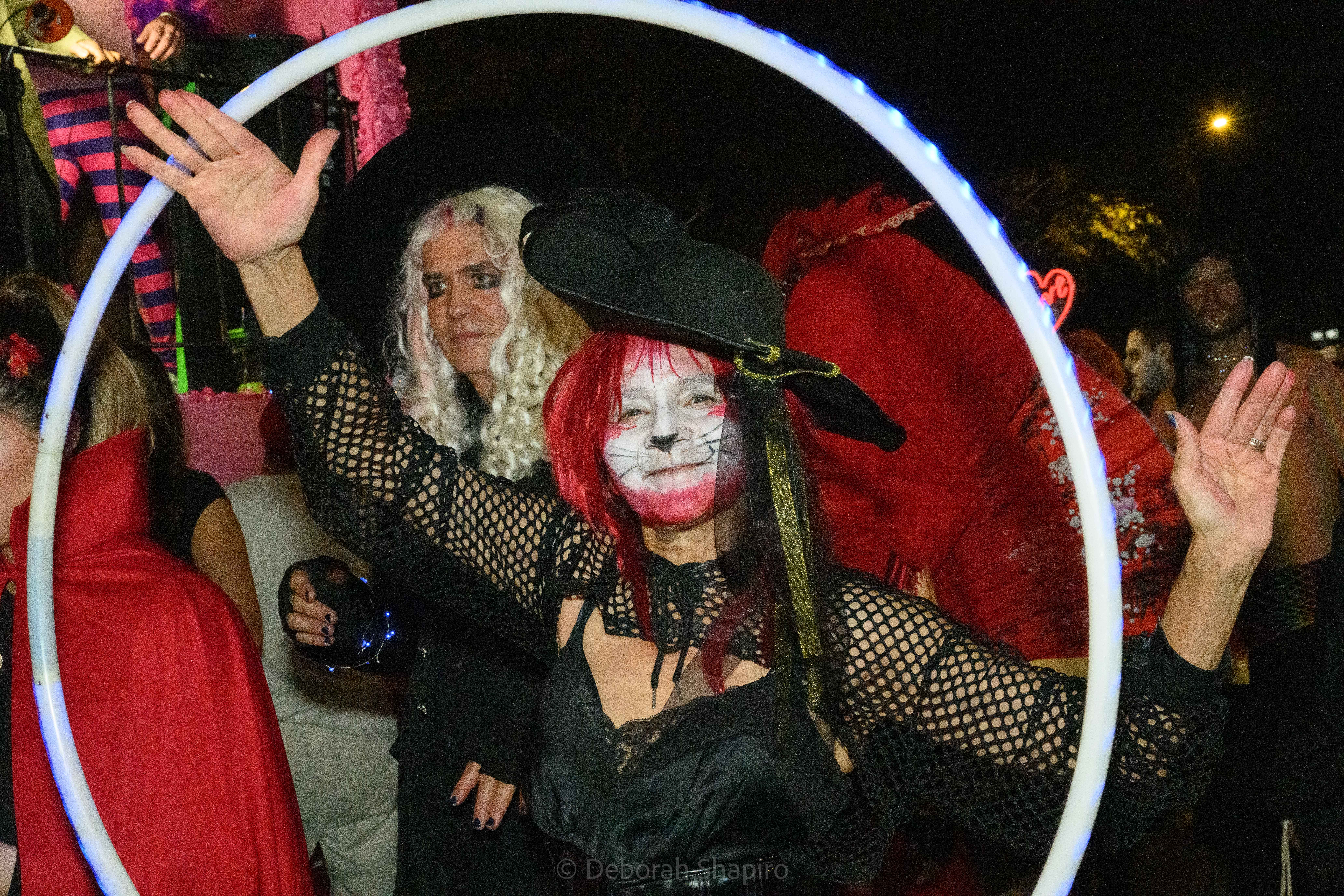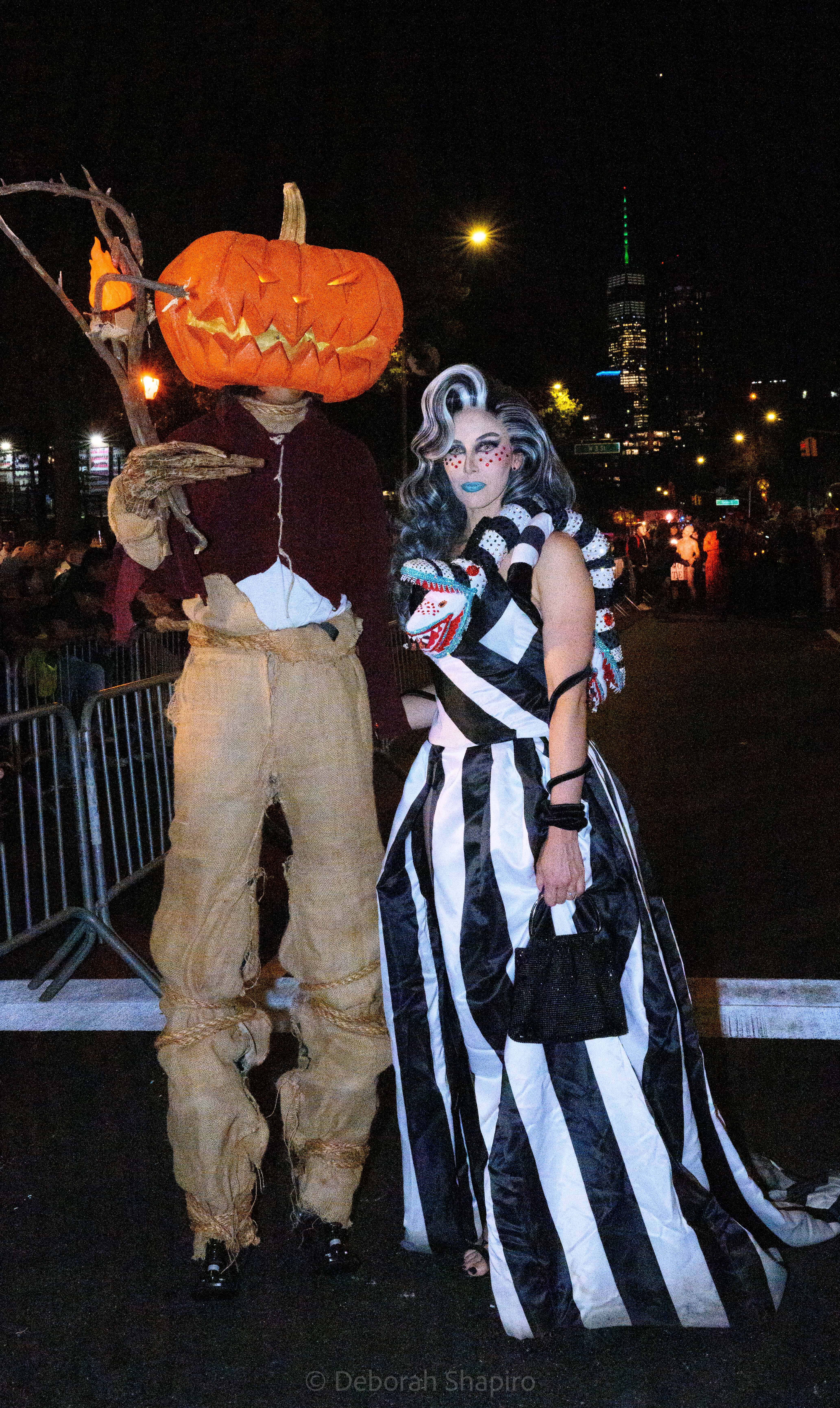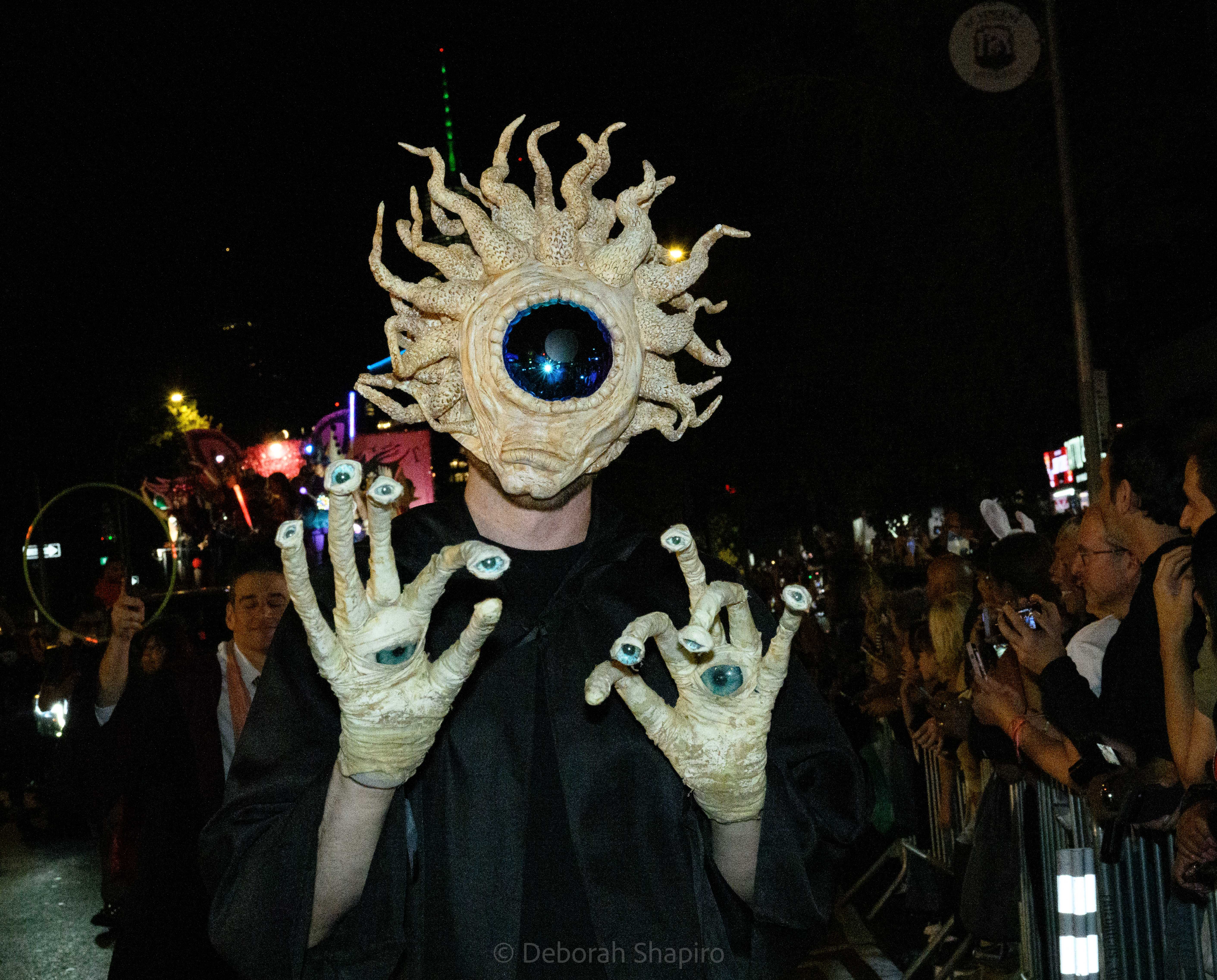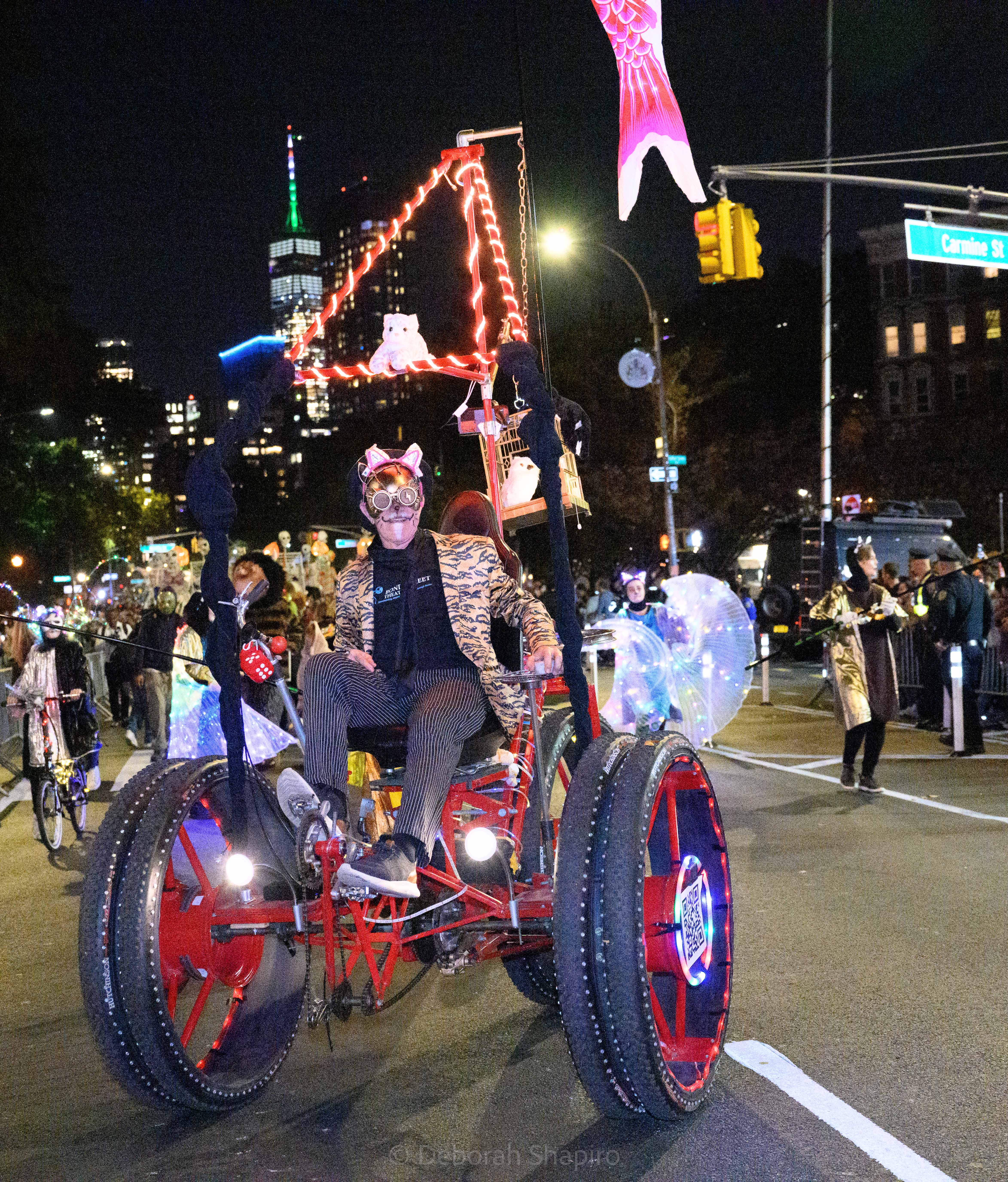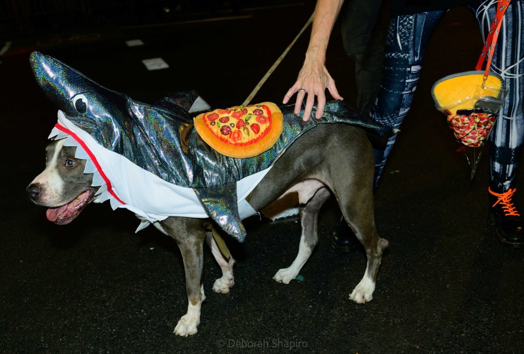 There was an award for best costume and I would have voted for this one.Cyclops meets MedusaThe parade moves up Sixth Avenue with the World Trade Center in the background A dog in a pizza shark costume was outnumbered by catsCat puppets march up Sixth AvenueA pink pussycatThis snake marionette appears every year and slithers fastThere was much satire directed at JD Vance’s “childless cat ladies” commentWith the presidential election in 5 days, political expression ran highThis Harris-Walz supporter was cheered by the spectatorsOne of the better caricature costumes More of the cat themeShe’s better dressedCats and cat pictures on the spectators’ phonesHalloween fell on a school night so no homework was done