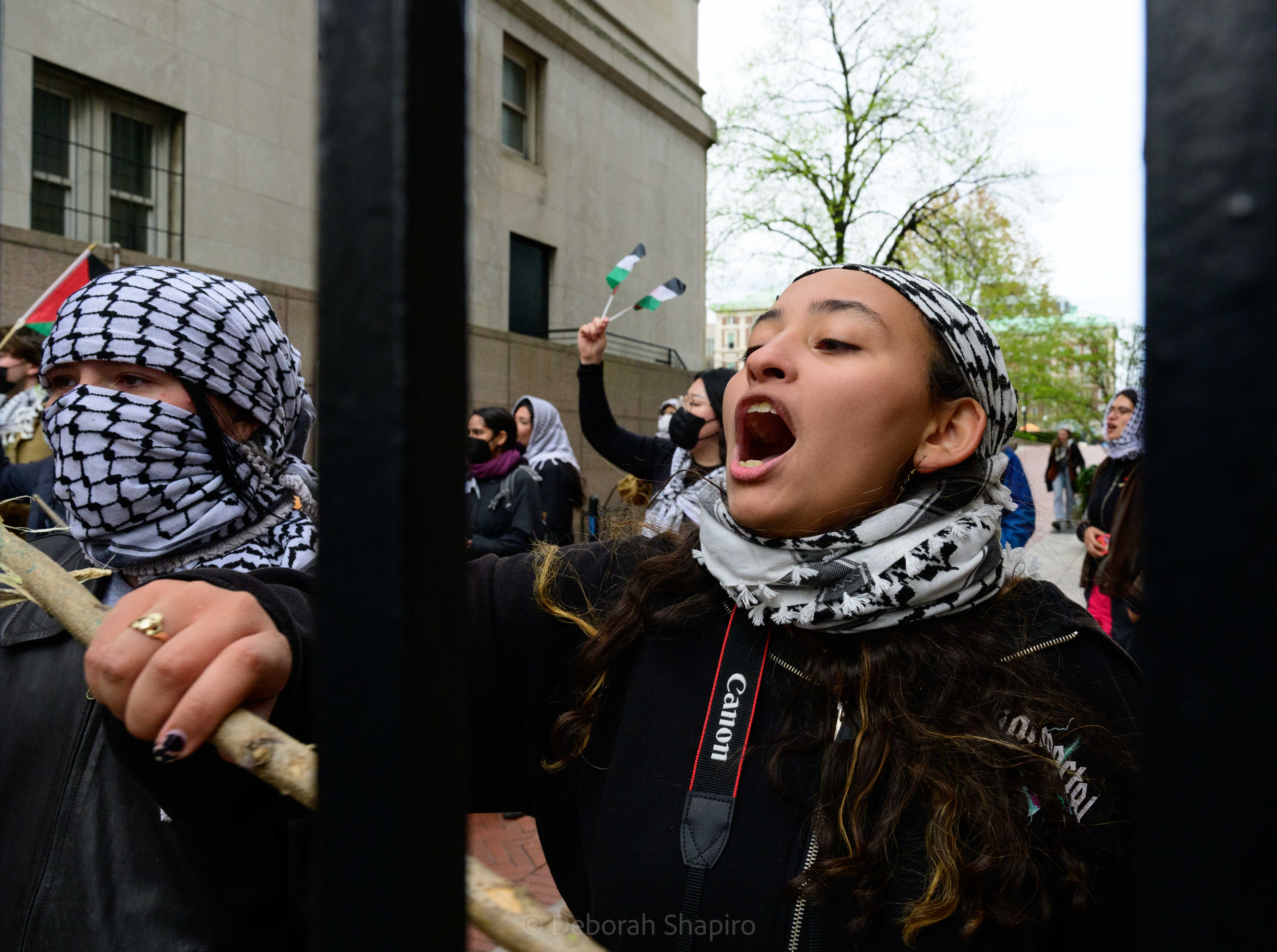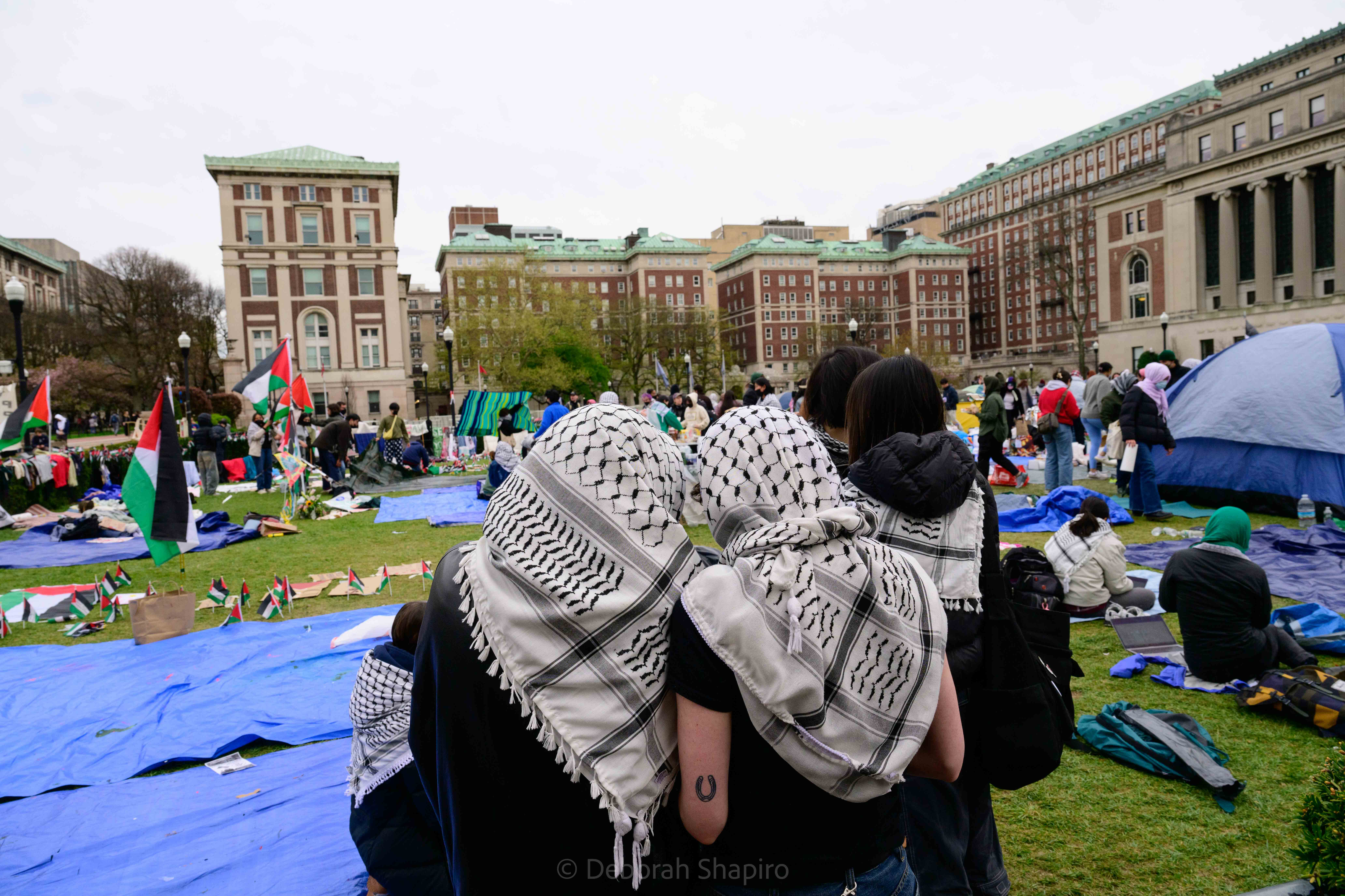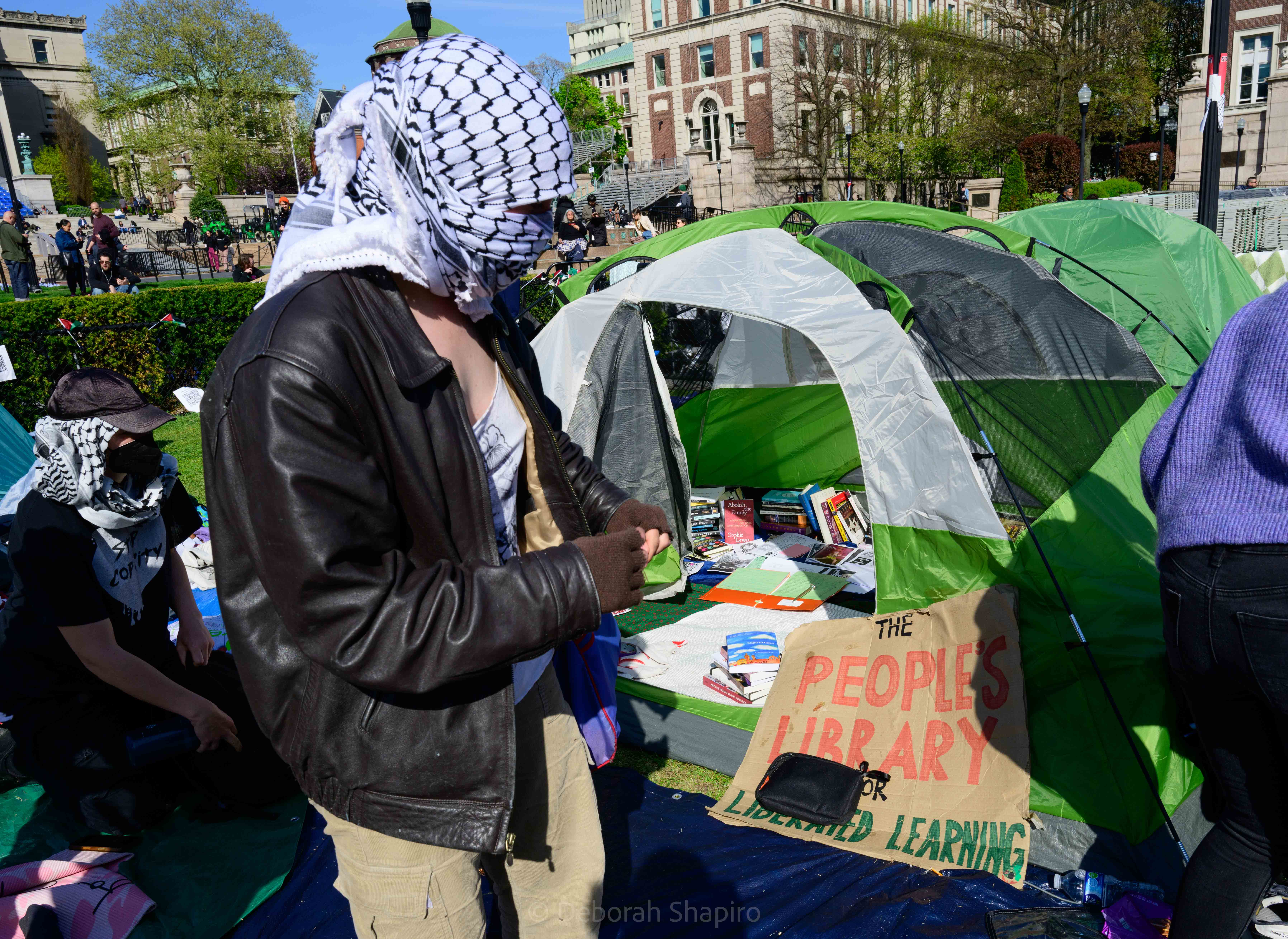 April 21, 2024: the “Gaza Solidarity Encampment” on the lawn in front of Butler LibraryApril 21: the main gate to the campus was locked and access to campus was restricted to Columbia ID holders. The blue and white balloons are the colors of Columbia and had been put up for Alumni Day at one of the schools.Behind the locked campus gates, students chanted slogans and beat drums while cheered by spectators on the sidewalk behind police lines.Student protesters behind the locked gatesDirectly opposite the students behind the gates, demonstrators gathered behind police barricades and joined the chants. These were not students and they were barred from entering the campus.The encampment, with students preparing to eat sandwiches and spend the nightStudents studying and settling into their tents for the night. The tent on the left belonged to some of the Jews For Palestine group.In the encampment, many students wore keffiyehs as symbols of the Palestinians whether or not they themselves were Palestinian. Most covered their faces and did not want to be photographed in order not to be identified and harassed on social media.