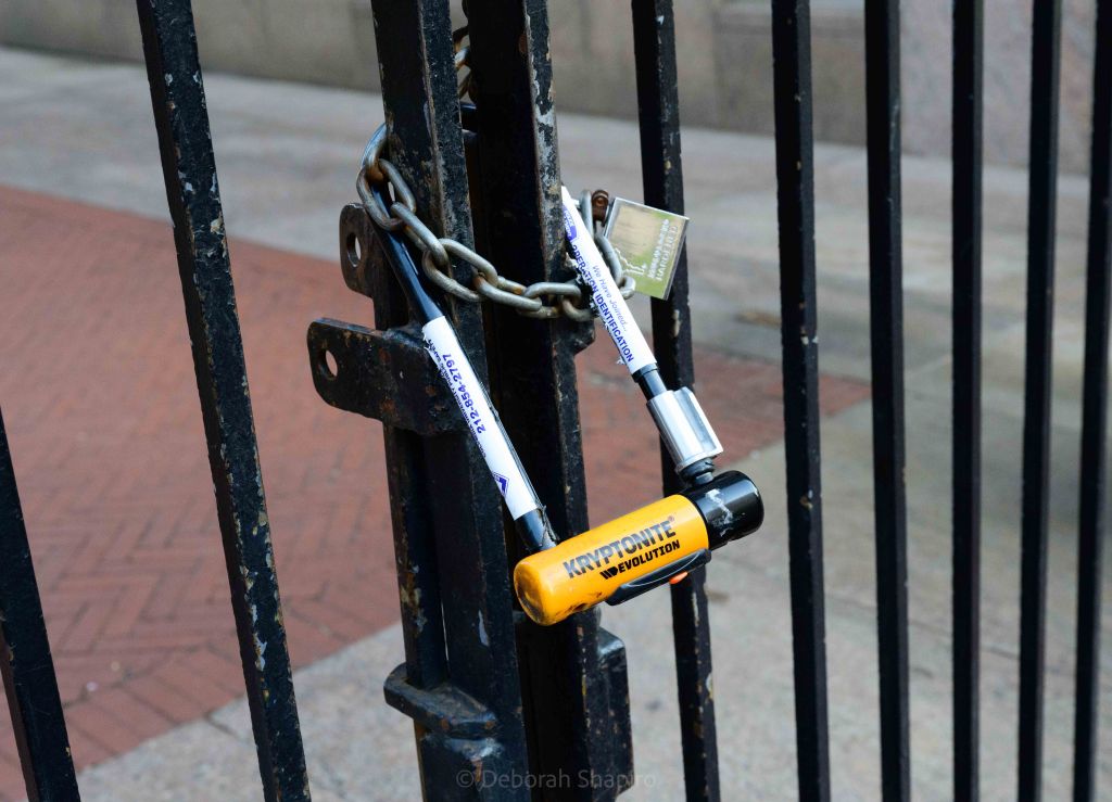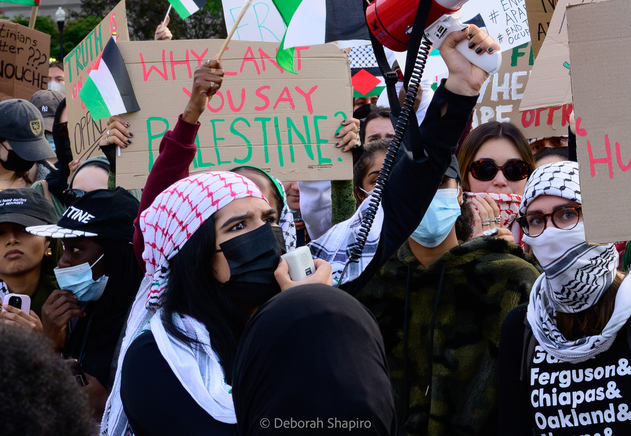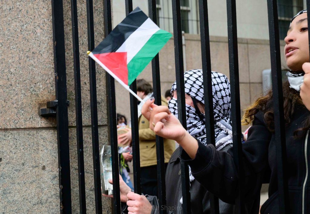 April 21, 2024: the “Gaza Solidarity Encampment” on the lawn in front of Butler LibraryApril 21: the main gate to the campus was locked and access to campus was restricted to Columbia ID holders. The blue and white balloons are the colors of Columbia and had been put up for Alumni Day at one of the schools.Behind the locked campus gates, students chanted slogans and beat drums while cheered by spectators on the sidewalk behind police lines.Student protesters behind the locked gatesDirectly opposite the students behind the gates, demonstrators gathered behind police barricades and joined the chants. These were not students and they were barred from entering the campus.The encampment, with students preparing to eat sandwiches and spend the nightStudents studying and settling into their tents for the night. The tent on the left belonged to some of the Jews For Palestine group.In the encampment, many students wore keffiyehs as symbols of the Palestinians whether or not they themselves were Palestinian. Most covered their faces and did not want to be photographed in order not to be identified and harassed on social media.