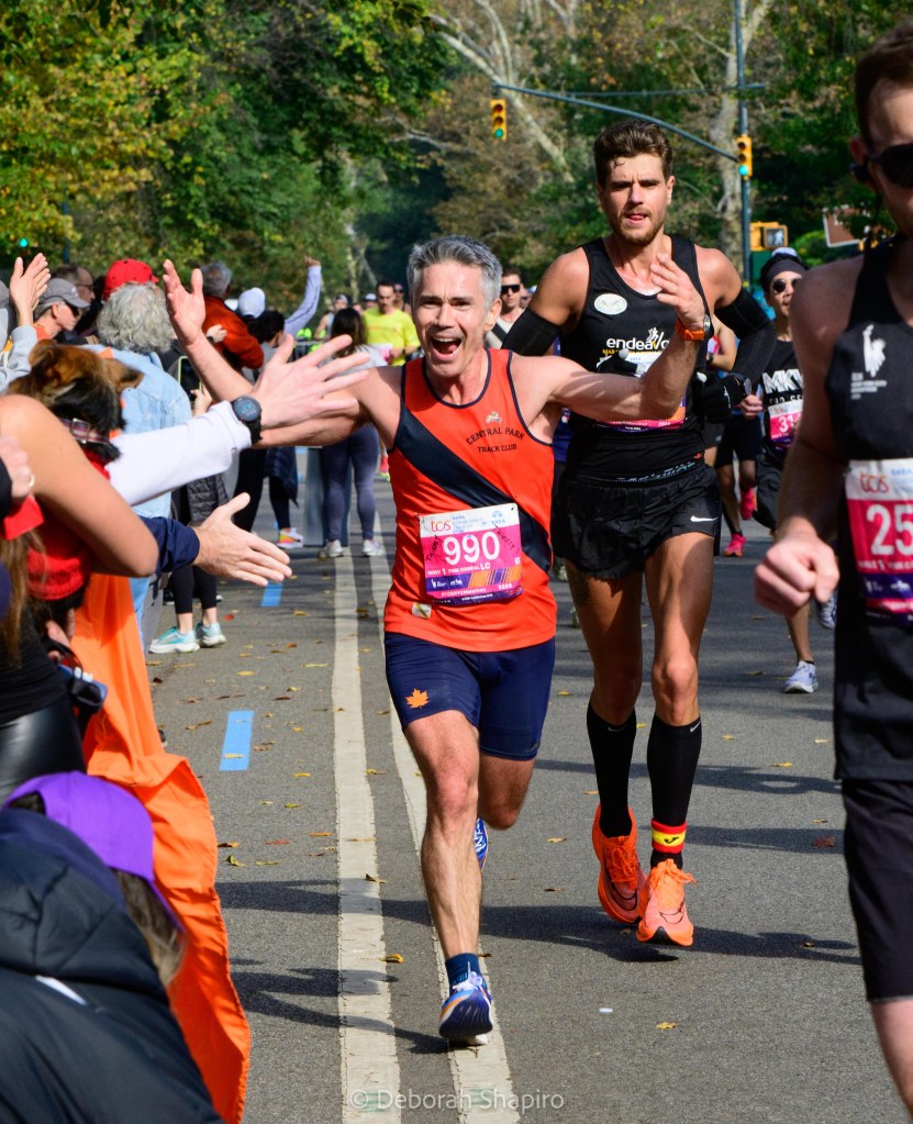 A runner from the Central Park Track Club is cheered by members of his club inside Central Park on the way to the finish line