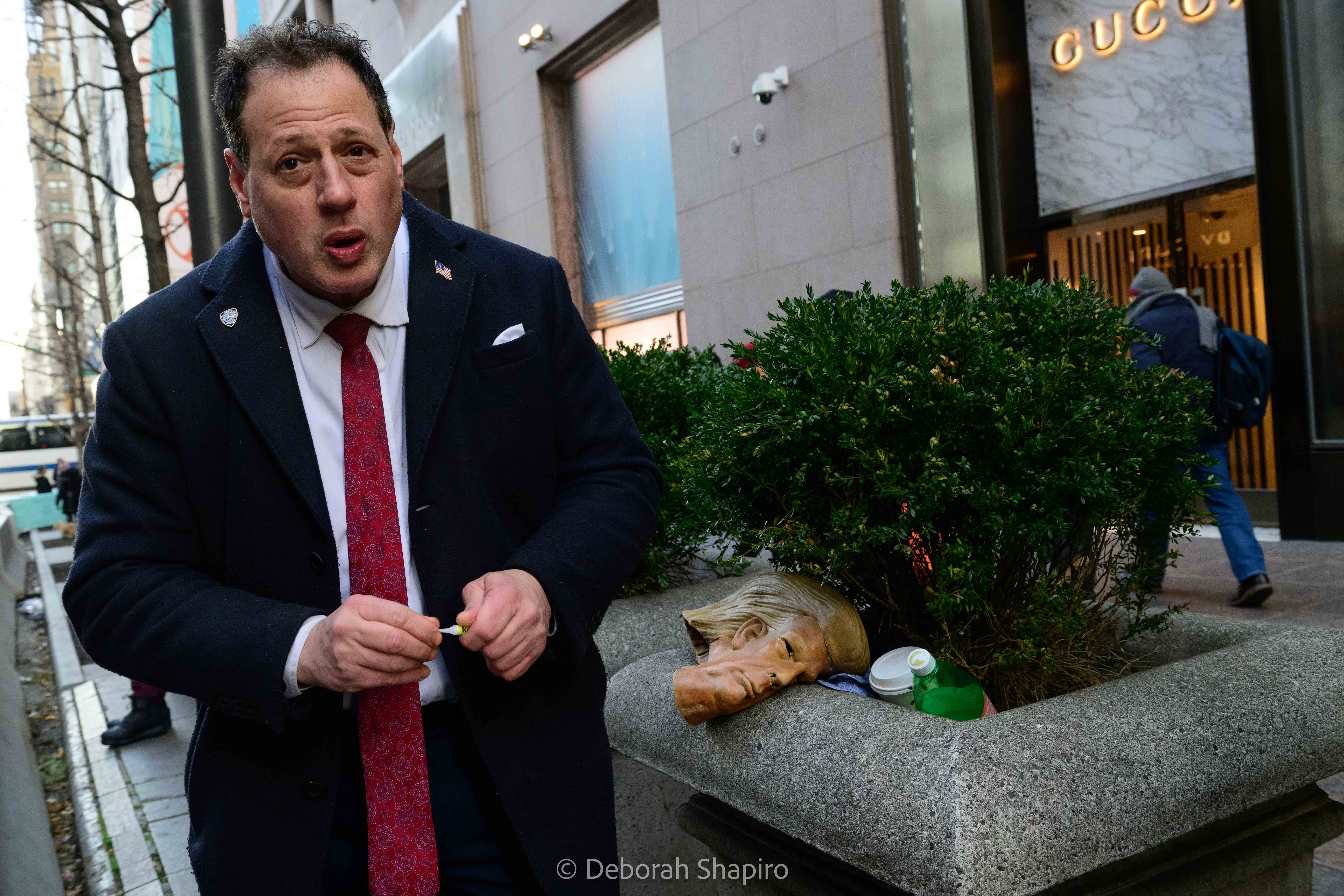 December 23: In front of Trump Tower, man named Neil who has made his living for the past six years doing impersonations of Donald Trump had to take off his mask to do emergency repair of the nose.
