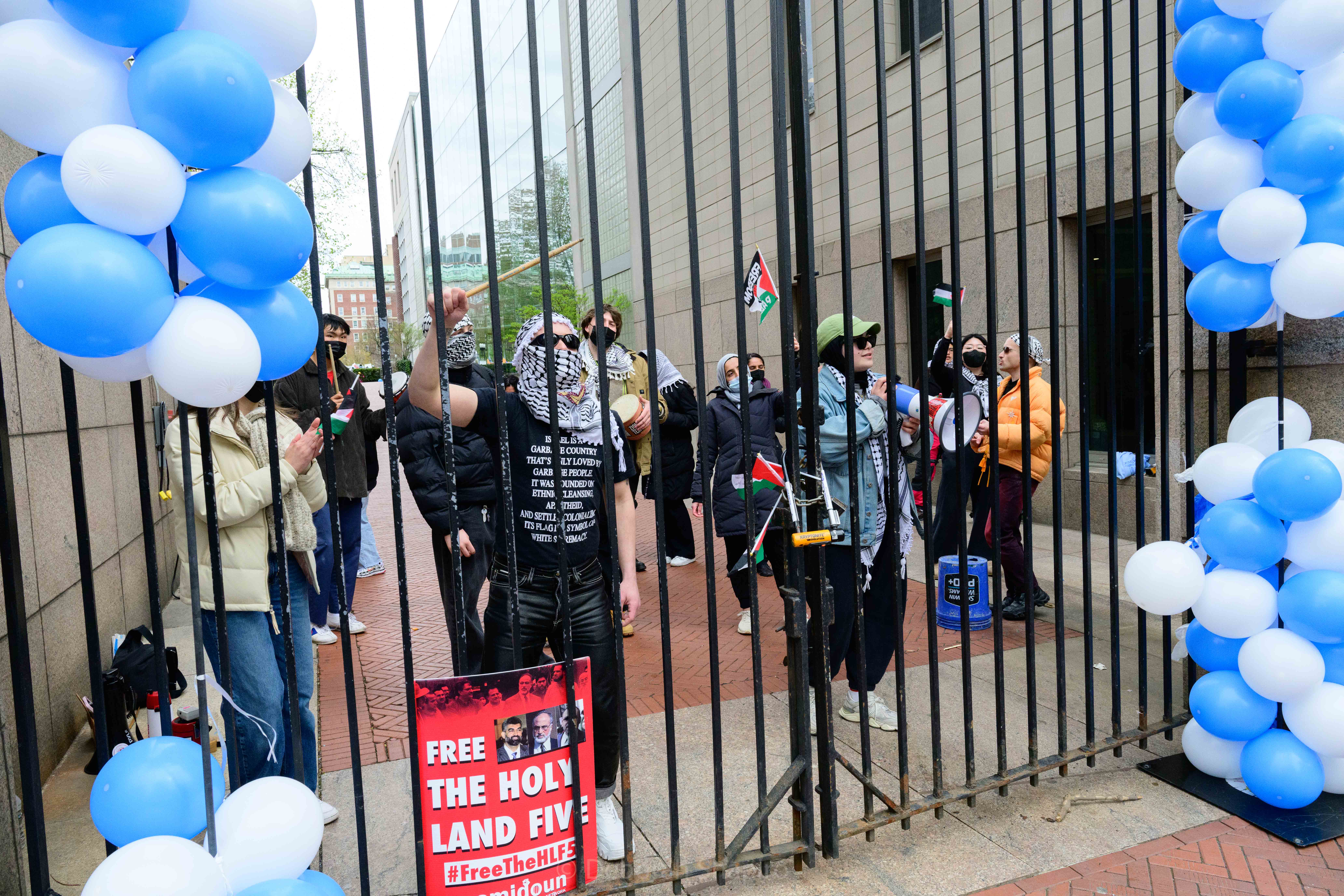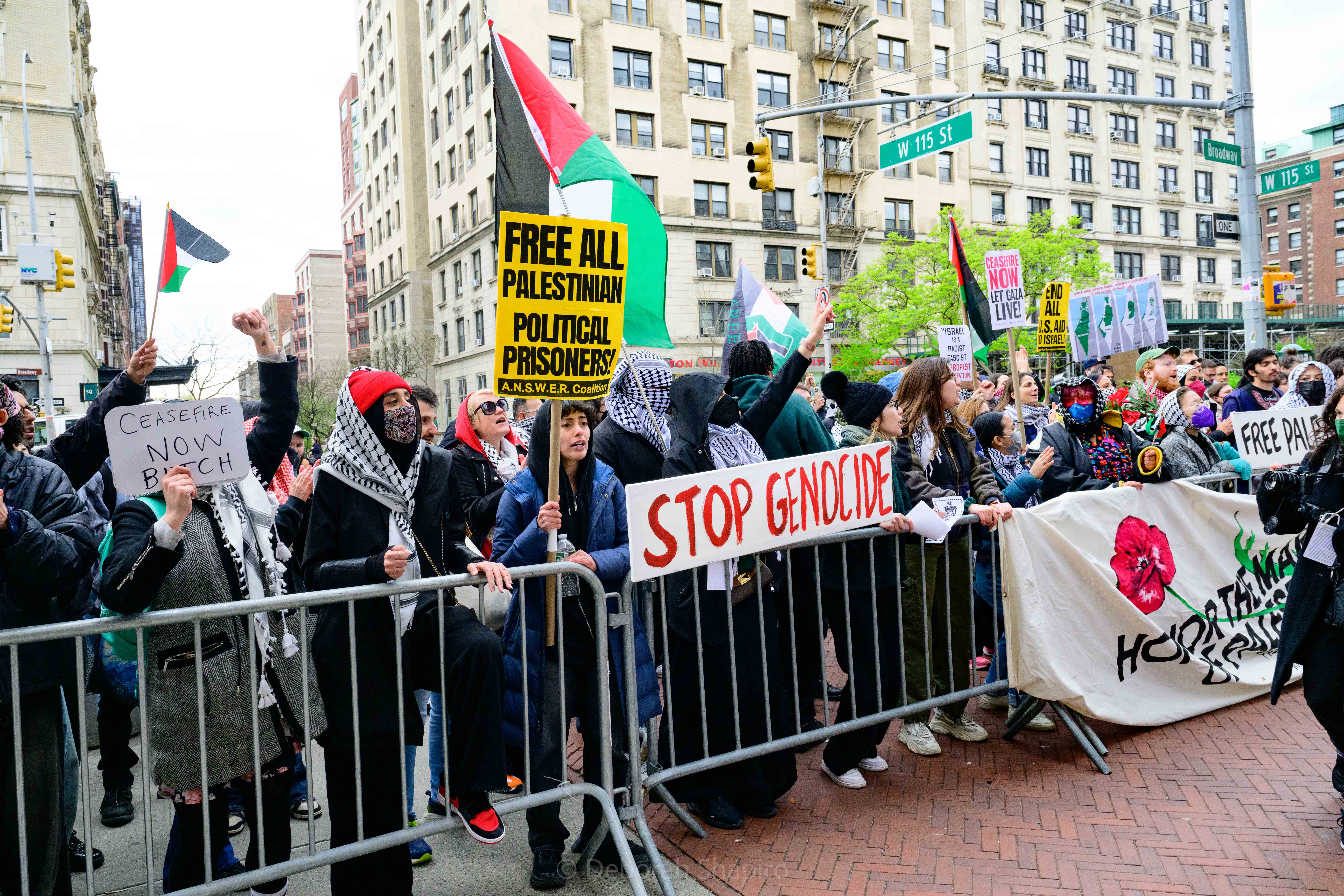 Also on October 12, on the other side of Butler Library at Columbia University, pro-Palestinian students held a rally at the same time as the silent vigil opposite them. Many demonstrators covered their faces. There was no mention of Hamas.