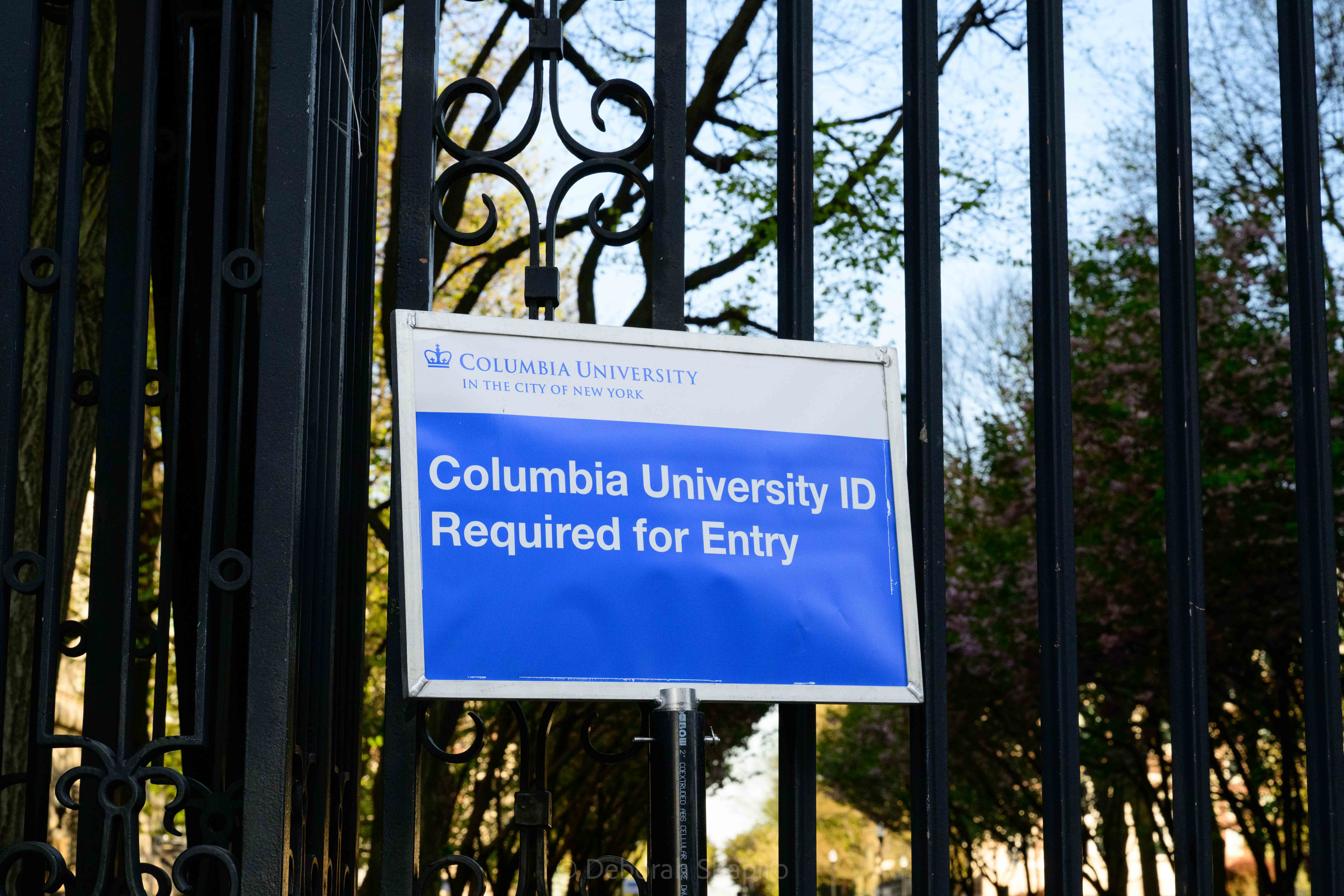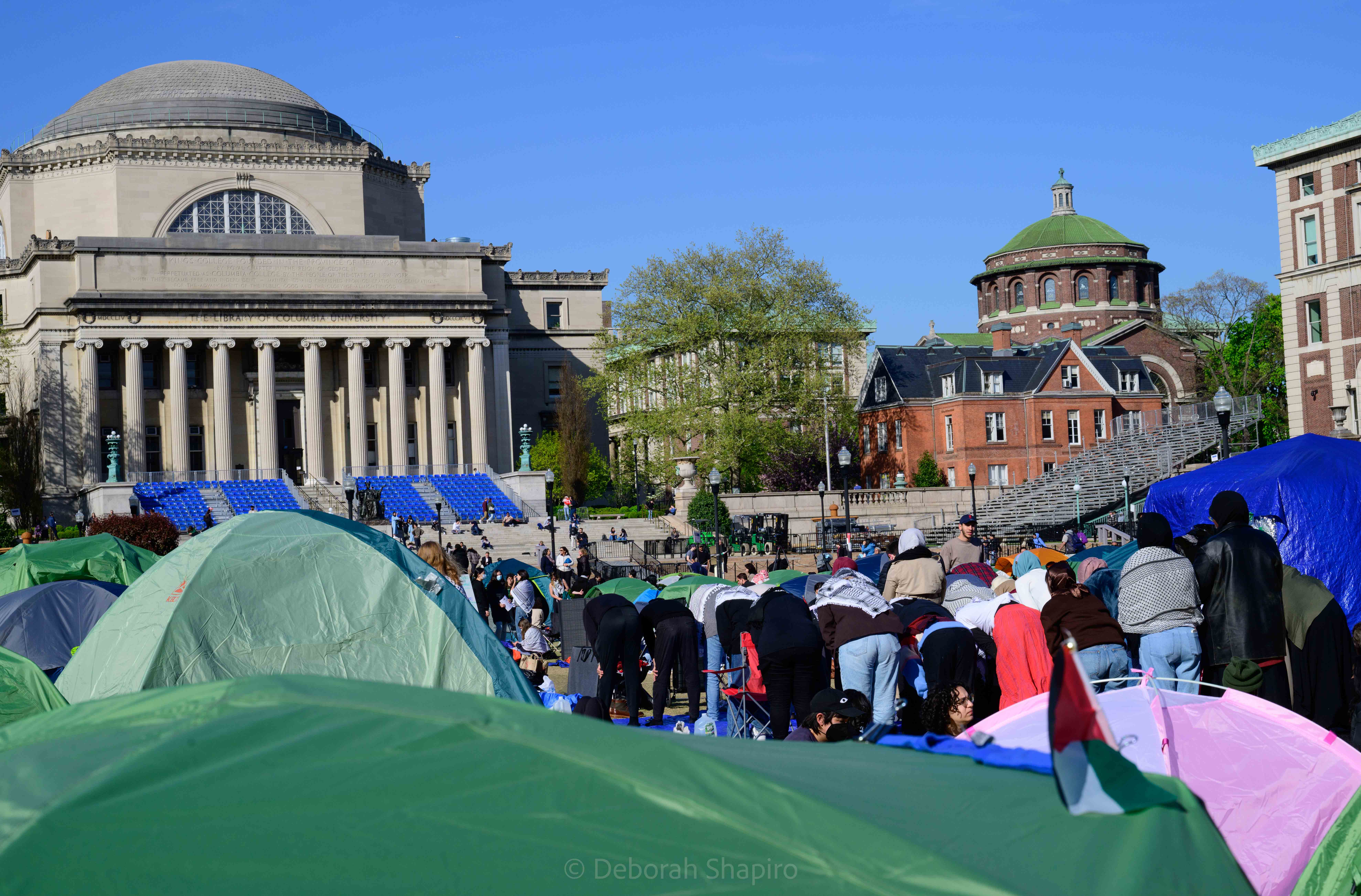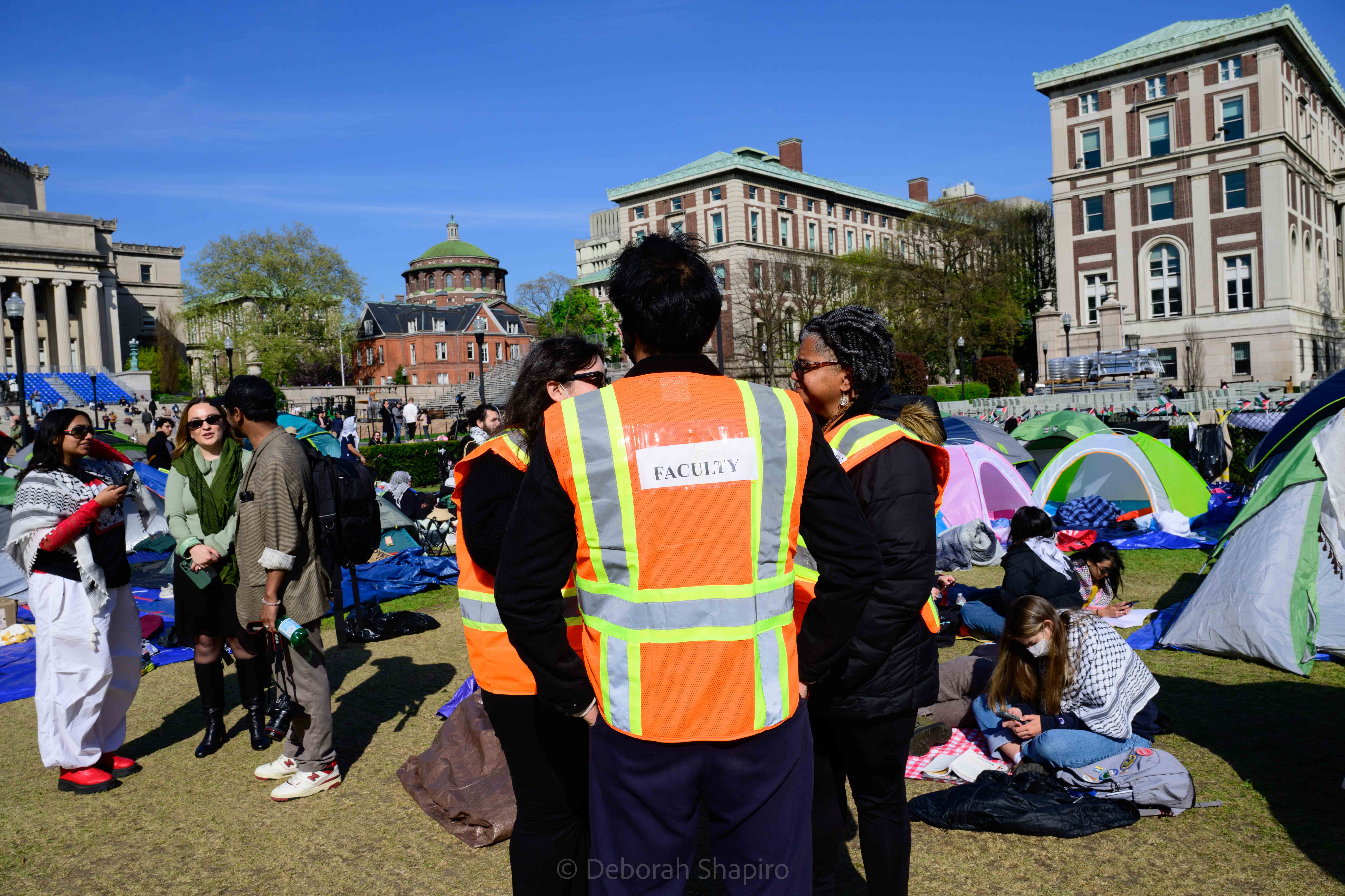 April 26: A pro-Israel demonstration demanding release of the Israeli hostages held in Gaza was held on the Columbia campus in front of Low Library (rear) where preparations are underway for the college graduation. April 26: Volunteer faculty monitors in the encampment formed a de-escalation team to prevent incidents of harassment from anyone inside or outside the protest. Multiple faculty members had gathered on the steps of Low Library, many in their academic gowns, to protest the actions of the president in inviting the police on to campus.At the “People’s Library for Liberated Learning,” protesters can borrow books or attend “learnings.”The busy schedule inside the encampment includes assemblies, Muslim prayer, and Jewish Shabbat services. During the last assembly the student negotiating team reports to the group about its daily talks with the Columbia administration. Muslim prayer, facing Low LibraryDonations of food and supplies flooded the encampment in the days after the arrests. This table features kosher food for Passover while the one next to it has halal food. A Passover Seder was held on the encampment with Jews and Muslims participating.The public is barred from the campus with strict security measures.A campus gateMany students came to campus in their graduation robes to take pictures in front of campus landmarks. Their graduation ceremony is scheduled for June 15 on the steps of the library opposite the encampment, which is occupying space needed for seating. No one knows whether the protesters will leave in time for graduation. These students graduated from high school four years ago during Covid and could not attend their own graduations then.
