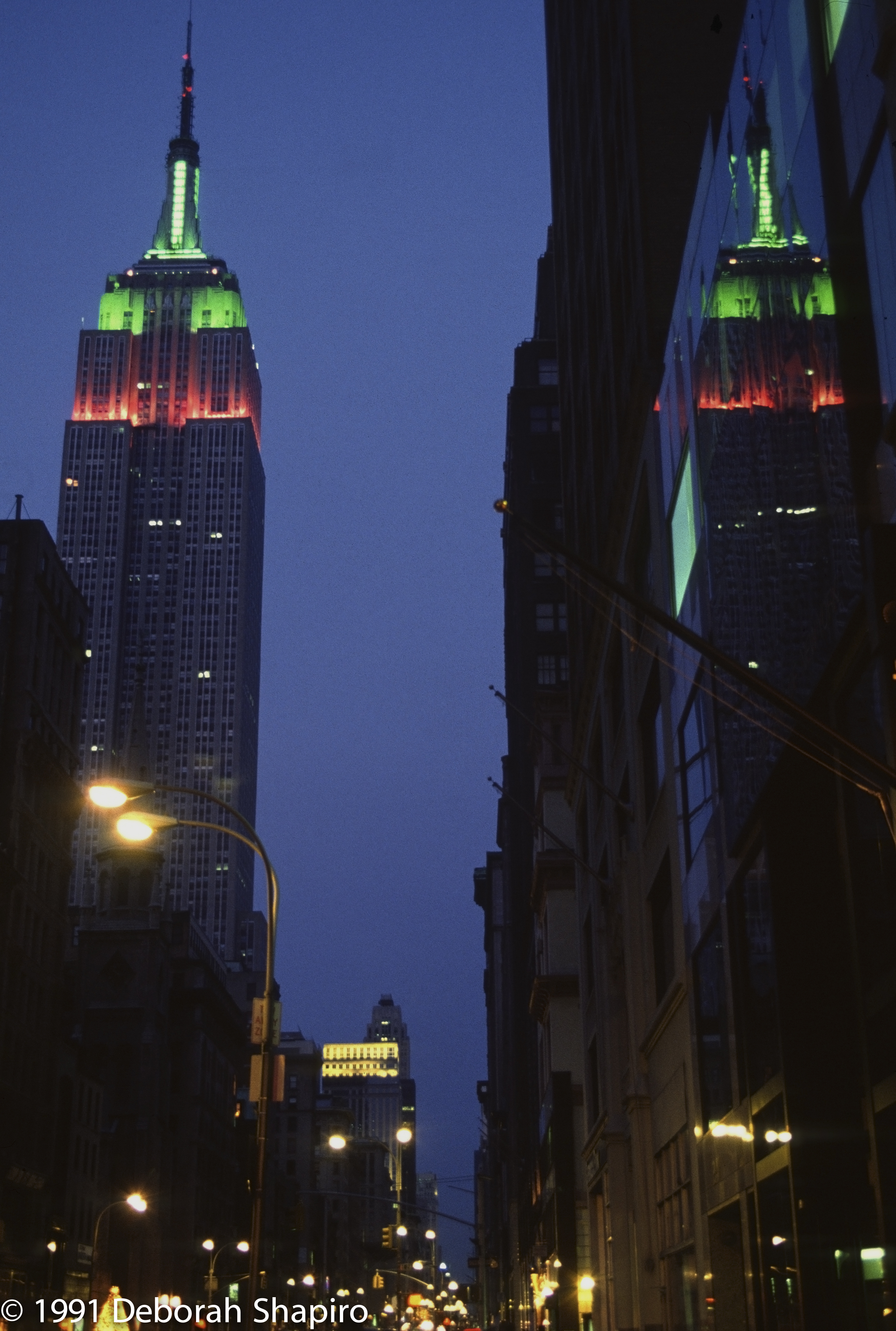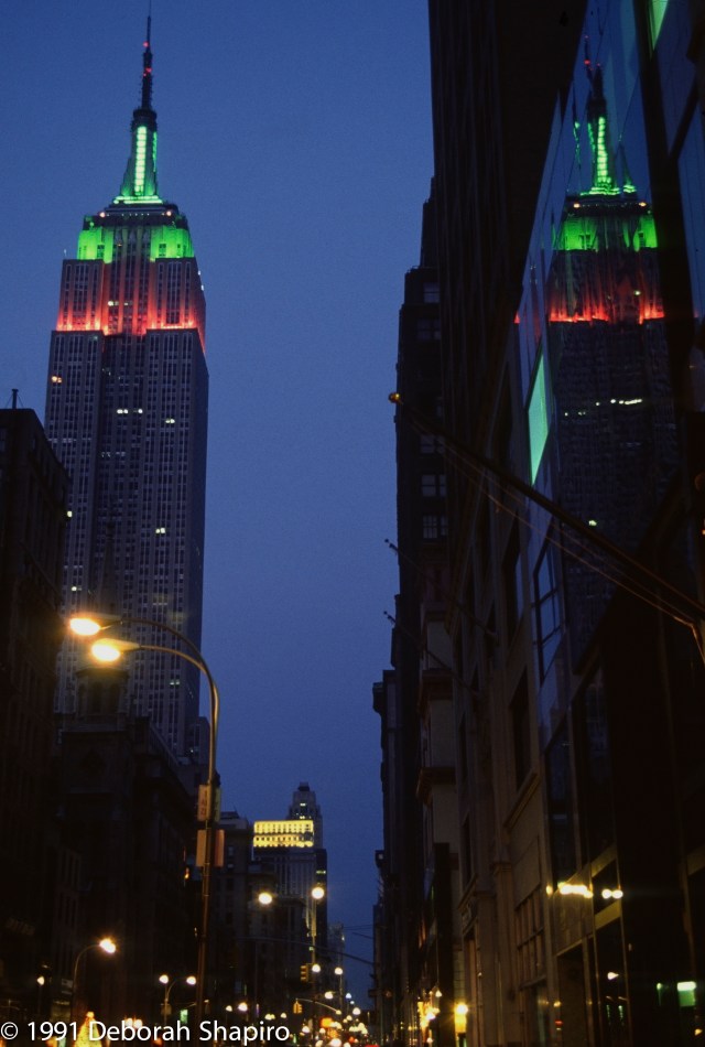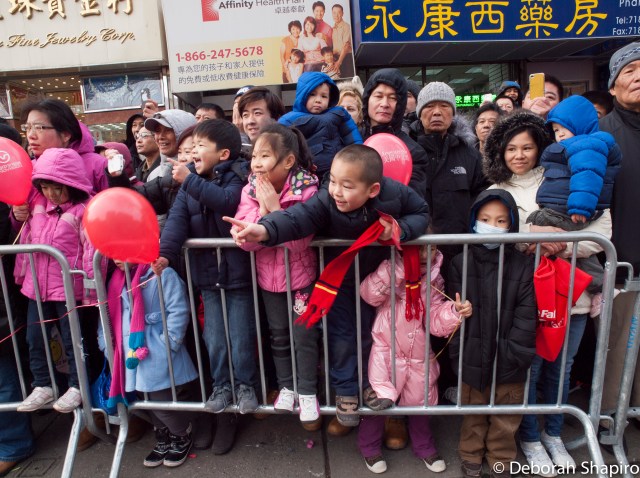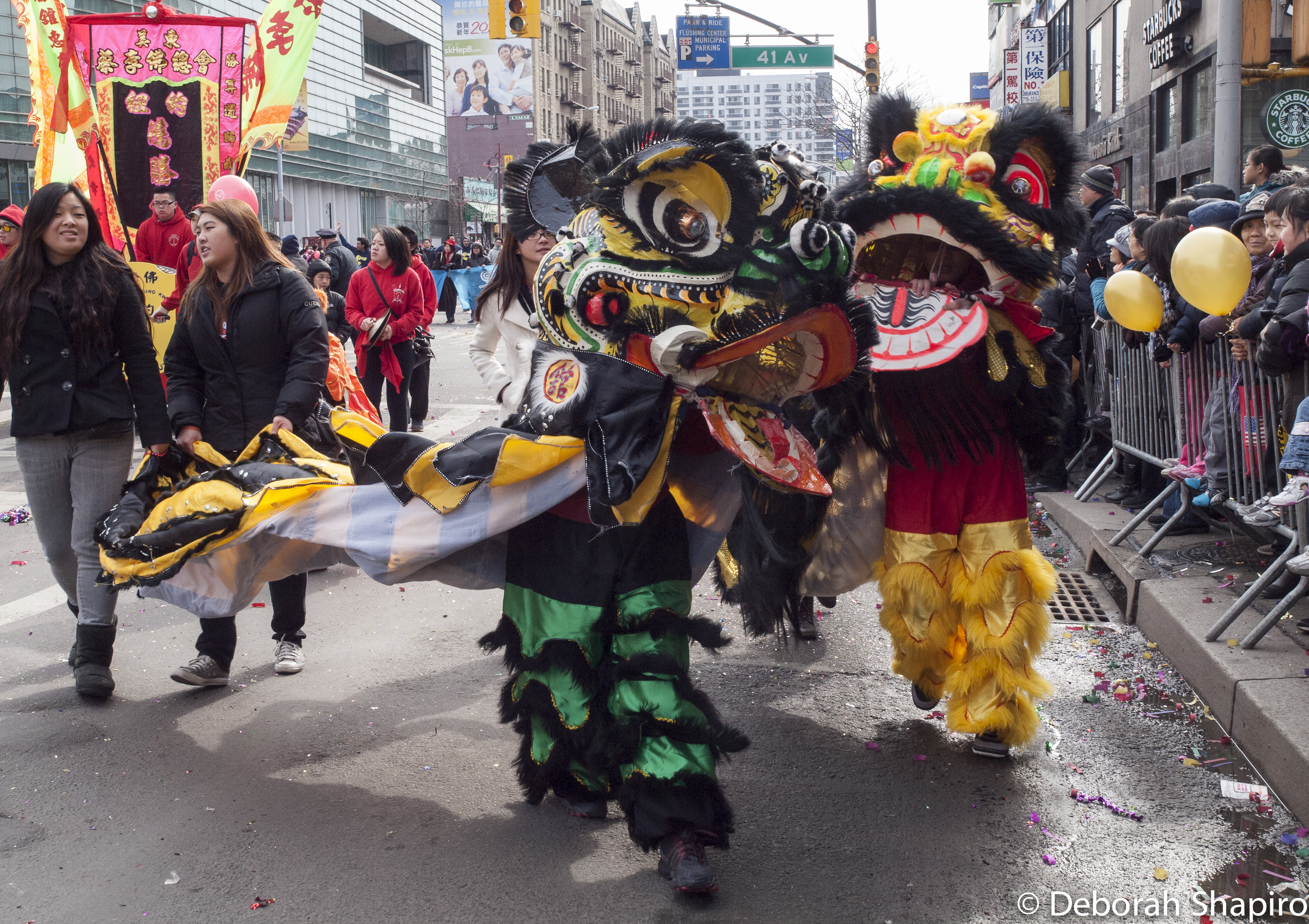 Firecrackers and fireworks are illegal in New York City, but back when I took these pictures the Chinese people had an exemption for the Lunar New Year, I believe on religious grounds. The lion dances shown here made earplugs absolutely necessary because of the deafening fireworks that were thrown directly at the dancers. So many rolls of firecrackers were exploded that the streets were full of smoke and carpeted with red paper, as in the second photo. One year when I went to take photographs it had rained, so that the dye from the firecracker wrappings made the streets appear to be streaming with blood. The Giuliani administration cracked down on fireworks (forgive the pun), and after September 11 this kind of spectacle was definitely no longer allowed. A few years ago I went back to see the much tamer New Year parade and missed the freewheeling days when roving crews of lion dancers worked their way up and down Mott, Pell, and Elizabeth Street. Weather permitting, I’ll try this year’s parades in Flushing and Chinatown and will not neglect to pack earplugs just in case.